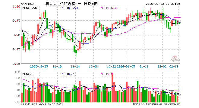 2月13日,科创创业ETF嘉实(588400)开盘跌0.53%,报0.943元。科创创业ETF嘉实(588400)重仓股方面,中际旭创开盘跌0.66%,新易盛跌1.02%,宁德时代跌0.07%,寒武纪跌1.12%,阳光电源跌1.31%,中芯国际跌0.30%,海光信息跌0.89%,胜宏科技跌0.65%,汇川技术跌0.40%,澜起科技跌0.78%。
