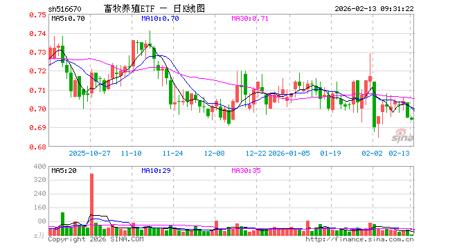 2月13日,畜牧养殖ETF(516670)开盘涨0.00%,报0.695元。畜牧养殖ETF(516670)重仓股方面,牧原股份开盘涨0.00%,海大集团跌0.09%,温氏股份涨0.19%,正邦科技涨0.00%,新希望涨0.12%,梅花生物涨0.00%,生物股份涨0.00%,大北农涨0.00%,圣农发展涨0.00%,立华股份涨0.66%。