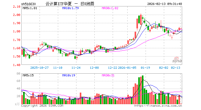 2月13日,云计算ETF华夏(516630)开盘跌0.49%,报1.831元。云计算ETF华夏(516630)重仓股方面,科大讯飞开盘跌1.59%,金山办公跌0.96%,中际旭创跌0.66%,新易盛跌1.02%,浪潮信息跌1.95%,中科曙光跌1.22%,紫光股份跌0.86%,恒生电子跌0.39%,拓维信息跌0.15%。