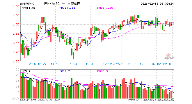 2月13日,创业板50ETF(159949)开盘跌0.58%,报1.551元。创业板50ETF(159949)重仓股方面,宁德时代开盘跌0.07%,中际旭创跌0.66%,新易盛跌1.02%,东方财富涨0.18%,阳光电源跌1.31%,胜宏科技跌0.65%,汇川技术跌0.40%,迈瑞医疗跌0.02%,天孚通信跌1.95%,亿纬锂能跌0.12%。