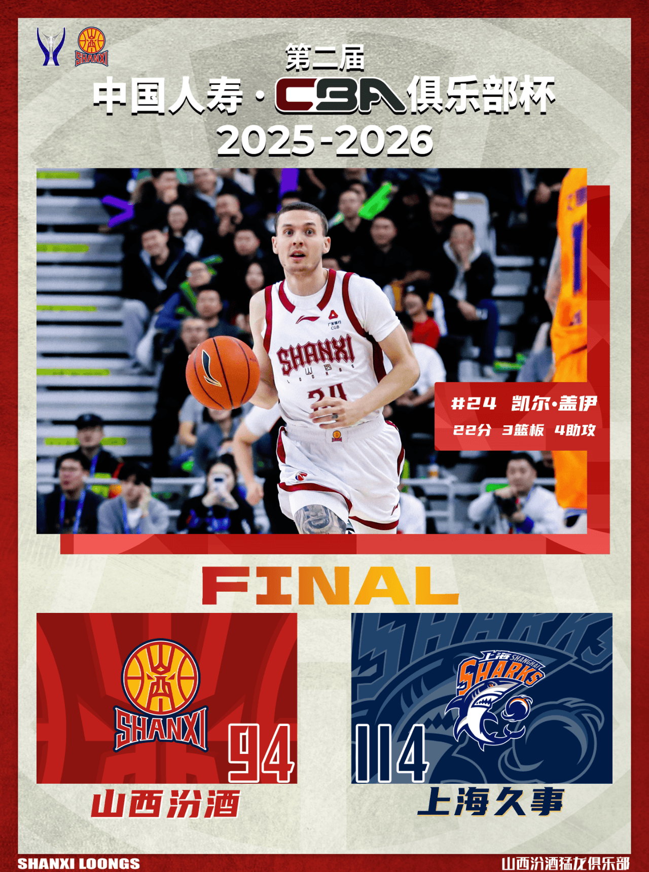 虎扑02月13日讯据山西男篮发文,北京时间2026年2月12日19:30,第二届中国人寿·CBA俱乐部杯决赛打响,山西汾酒在内蒙古体育馆,挑战卫冕冠军上海久事。本场比赛,山西队进攻状态欠佳,防守不够积极主动,包括篮板球处于劣势,导致大比分落后,下半场全队有明显改善,并在末节奋力追分,但终究不敌对手,最终全场比赛结束,山西汾酒94:114不敌上海久事,获得第二届CBA俱乐部杯亚军。