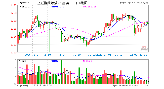 2月13日,上证指数增强ETF嘉实(562810)开盘涨0.00%,报1.176元。上证指数增强ETF嘉实(562810)重仓股方面,中国石油开盘跌2.17%,工商银行涨0.14%,农业银行涨0.30%,贵州茅台涨0.00%,工业富联跌1.59%,紫金矿业跌3.75%,中国人寿涨0.37%,中国银行涨0.19%,中国电信涨0.00%,招商银行跌0.10%。