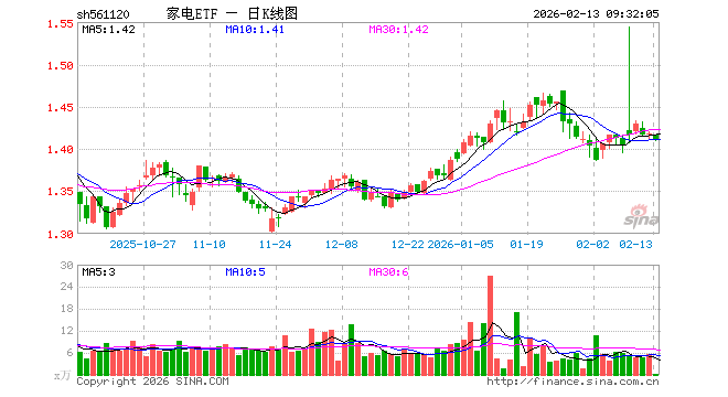 2月13日,家电ETF(561120)开盘跌0.07%,报1.417元。家电ETF(561120)重仓股方面,格力电器开盘涨0.00%,美的集团跌0.36%,三花智控跌0.99%,海尔智家跌0.04%,麦格米特跌1.54%,四川长虹跌0.31%,石头科技跌0.20%,海信视像涨0.00%,科沃斯涨0.06%,兆驰股份涨0.00%。