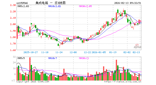 2月13日,集成电路ETF(159546)开盘跌1.45%,报2.038元。集成电路ETF(159546)重仓股方面,寒武纪开盘跌1.12%,中芯国际跌0.30%,海光信息跌0.89%,兆易创新涨0.00%,澜起科技跌0.78%,豪威集团跌0.42%,紫光国微跌0.83%,长电科技跌1.35%,芯原股份跌2.78%,通富微电跌1.63%。