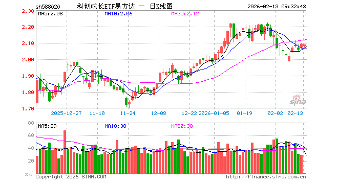 2月13日,科创成长ETF易方达(588020)开盘跌0.57%,报2.080元。科创成长ETF易方达(588020)重仓股方面,海光信息开盘跌0.89%,寒武纪跌1.12%,拓荆科技跌0.34%,源杰科技跌3.47%,九号公司涨0.74%,国盾量子跌1.34%,仕佳光子跌1.90%,思特威跌0.48%,百利天恒跌1.21%,铂力特跌0.50%。