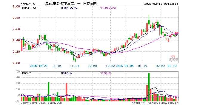 2月13日,集成电路ETF嘉实(562820)开盘跌0.79%,报2.523元。集成电路ETF嘉实(562820)重仓股方面,寒武纪开盘跌1.12%,中芯国际跌0.30%,海光信息跌0.89%,兆易创新涨0.00%,澜起科技跌0.78%,豪威集团跌0.42%,紫光国微跌0.83%,长电科技跌1.35%,芯原股份跌2.78%,通富微电跌1.63%。