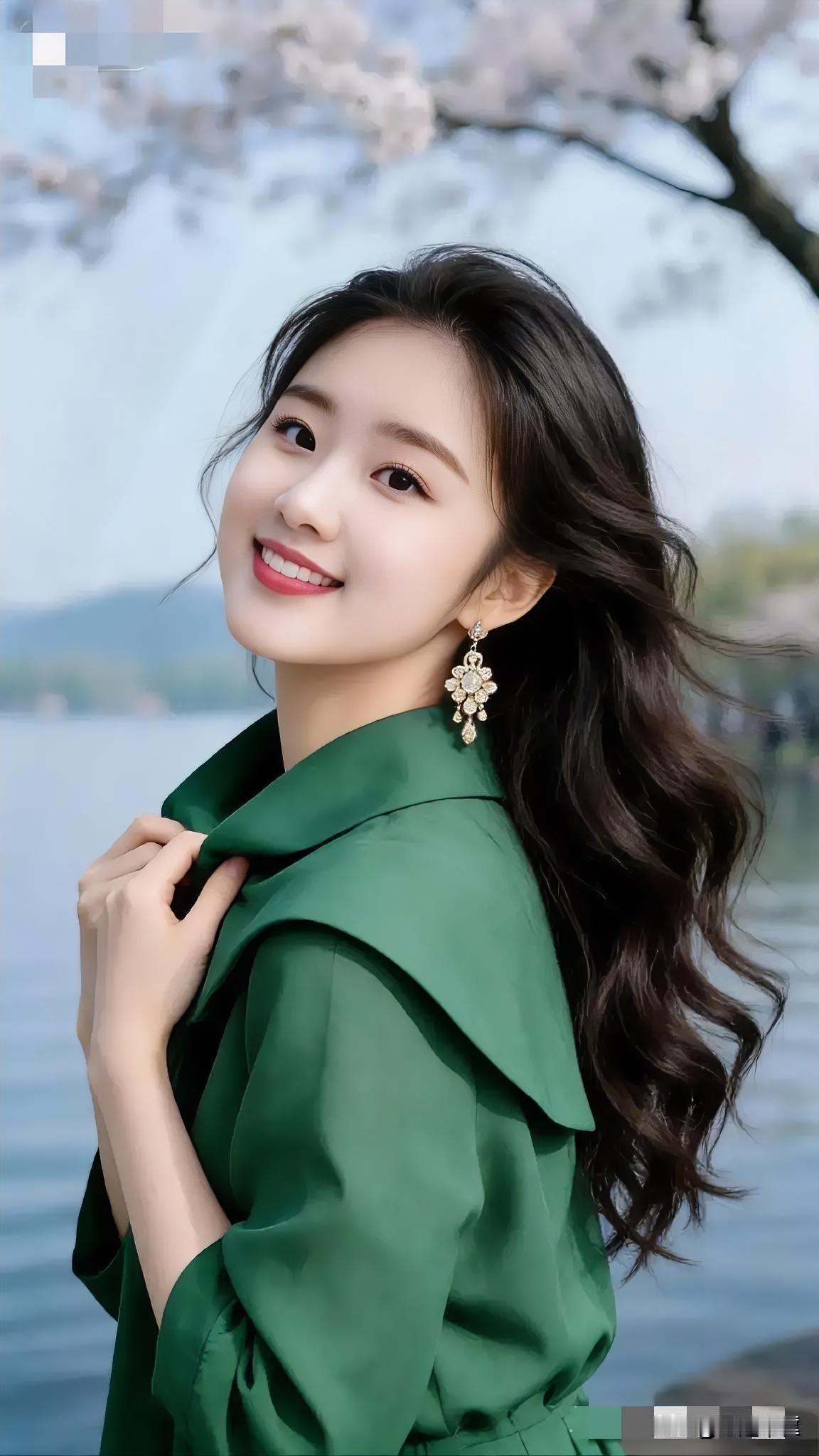 春日樱花下的温柔微笑,绿衣少女与自然相映成趣。
