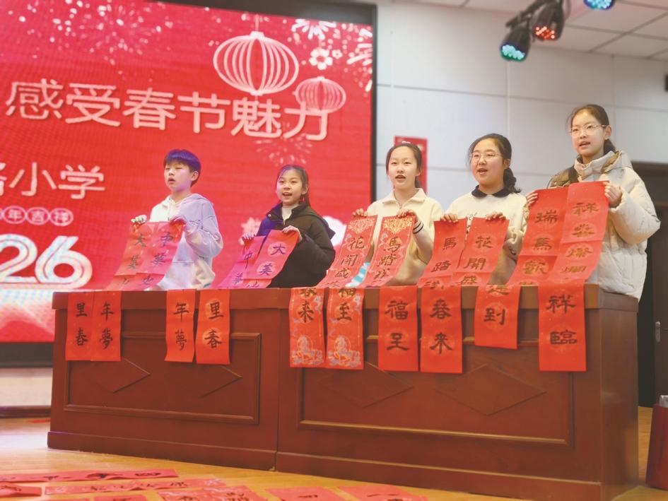 活动现场,吉祥的装饰与淡淡的墨香交织,洋溢着喜庆氛围。六年级的“小小书法家”专注写下“学海飞舟搏碧浪,书山平步上青云”的联句,笔迹虽显稚嫩,却一笔一画尽显认真。同学们围坐桌前,互相品评、笑语不断,红纸铺展,墨迹流转,构成一幅生动的年节画卷。一位家长边协助孩子压纸边感慨:“和孩子一起写春联,感受这份专注与热闹,才是记忆中最地道的年味。”活动最后,孩子们手持作品合影,红彤彤的春联映衬着笑脸,宛如鲜活的年画。孩子们通过亲手书写,不仅体验了节日习俗,更在笔墨纸砚间延续着文化血脉,让传统年味流淌心间,迎接充满希望的新春。