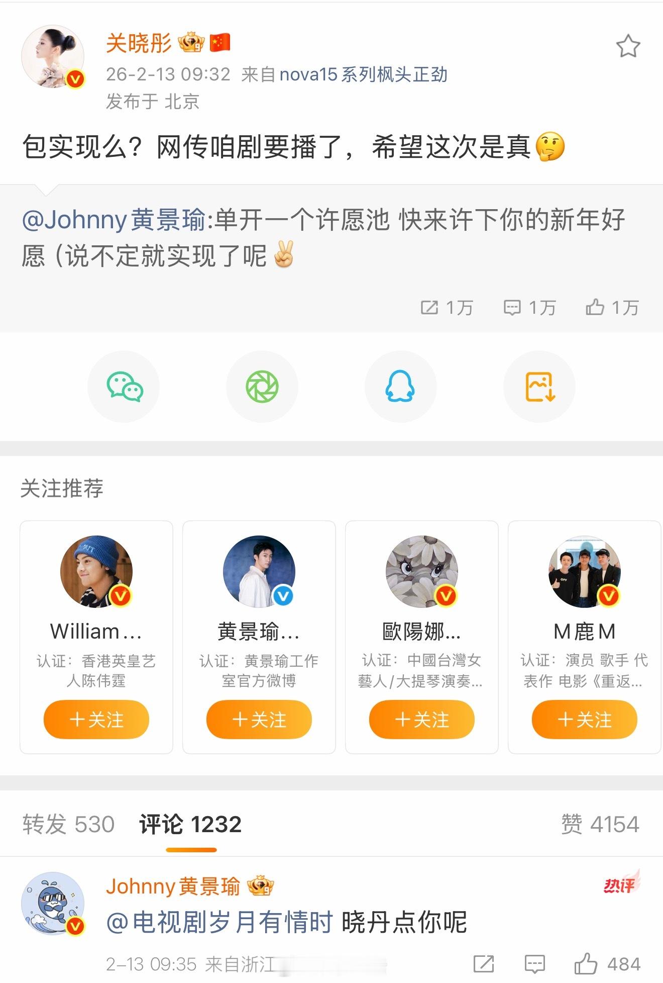 恭喜黄景瑜、关晓彤主演的岁月有情时定档2月20号,两位主演在线催播。