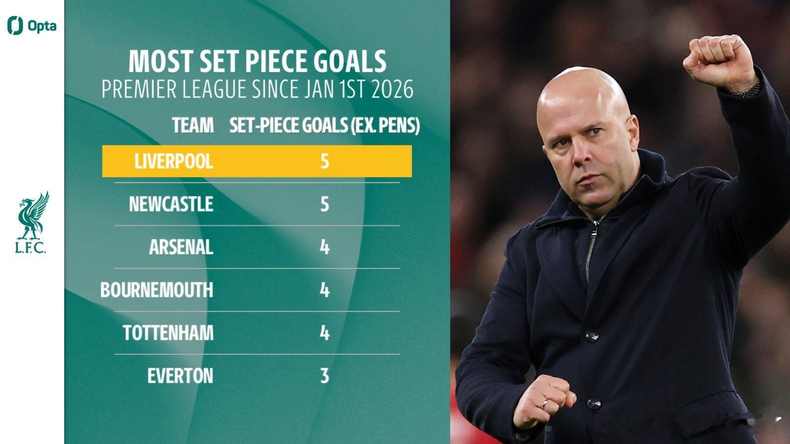 这是利物浦在 2026 年的第 5 个定位球进球,比纽卡,阿森纳,伯恩茅斯其他任何球队都多。