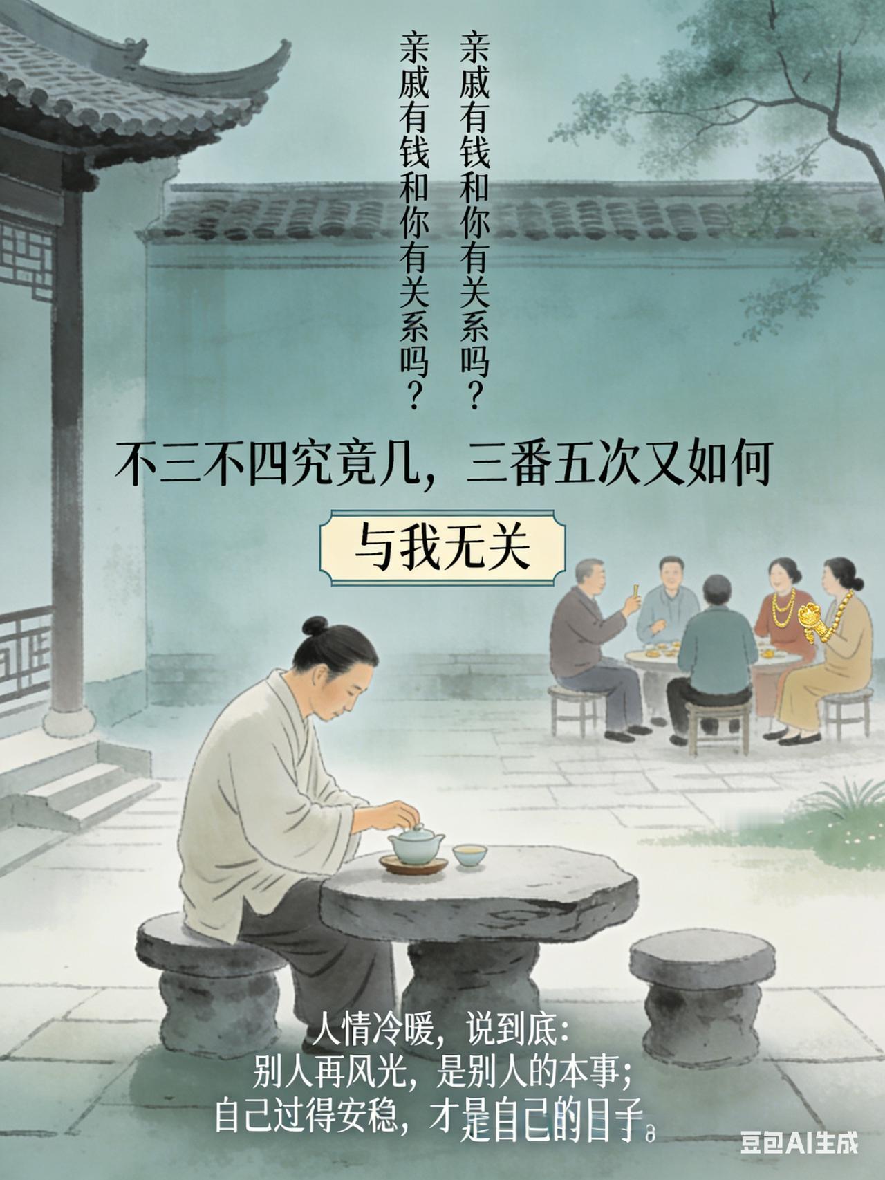 亲戚有钱和你有关系吗?亲戚有钱和你有关系吗? 不三不四究竟几, 三番五次又如何 横批:与我无关 人情冷暖,说到底: 别人再风光,是别人的本事; 自己过得安稳,才是自己的日子。