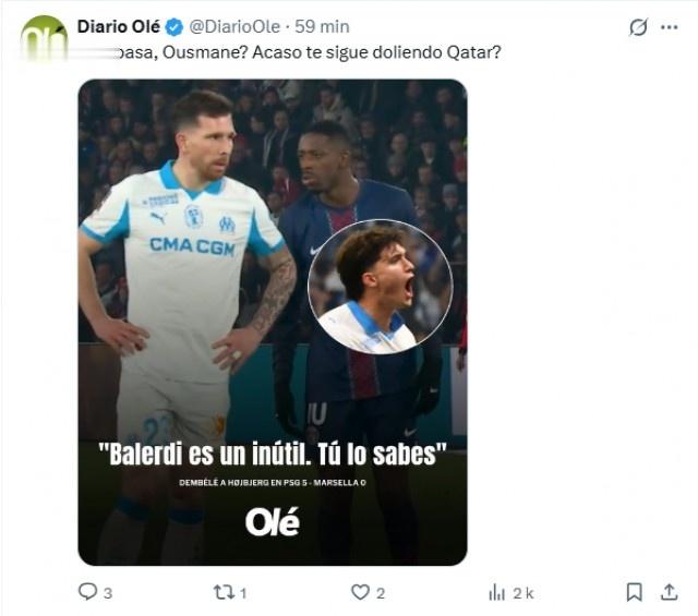 这一事件甚至传回了阿根廷,阿根廷方面当然力挺这位马赛球员。“在巴黎圣日耳曼队与马赛队比赛中,巴列尔迪(LeonardoBalerdi)再次成为焦点。在王子公园球场以5-0惨败的比赛中,这位阿根廷后卫遭到了登贝莱的辱骂。”Tyc体育这样描述道,并补充说明“‘烂’这个词在法语中虽然常见,但在此处被解读为一种侮辱”。