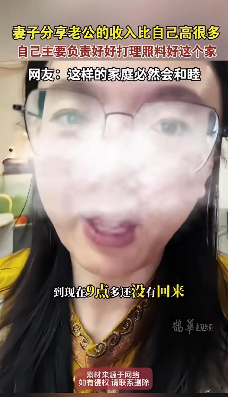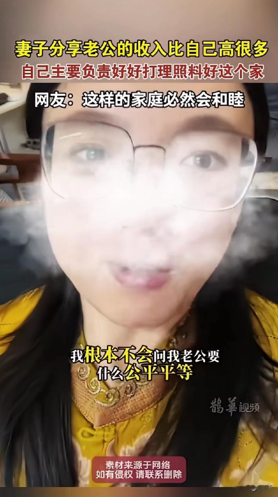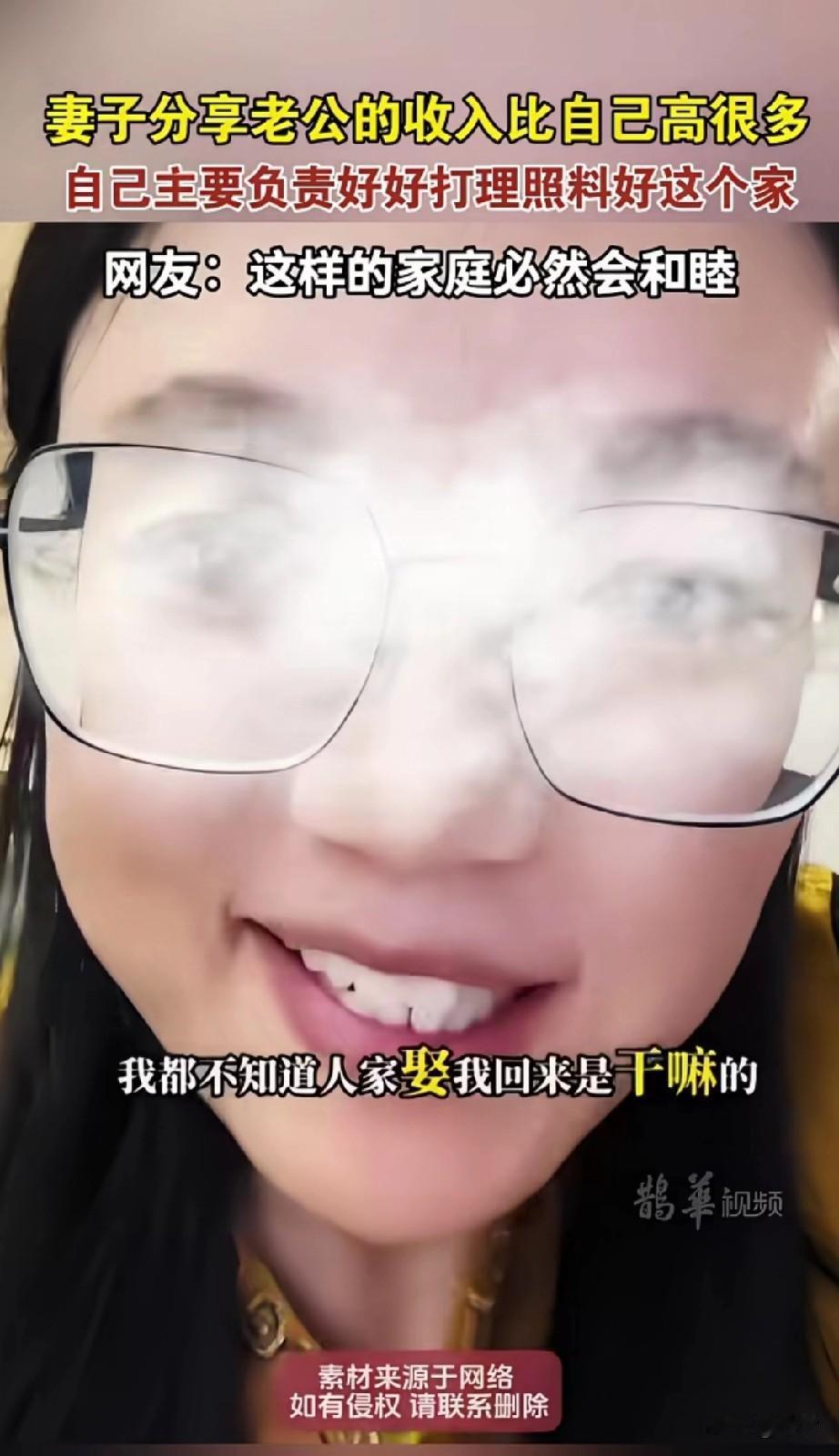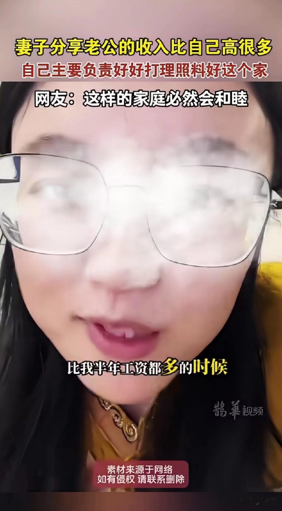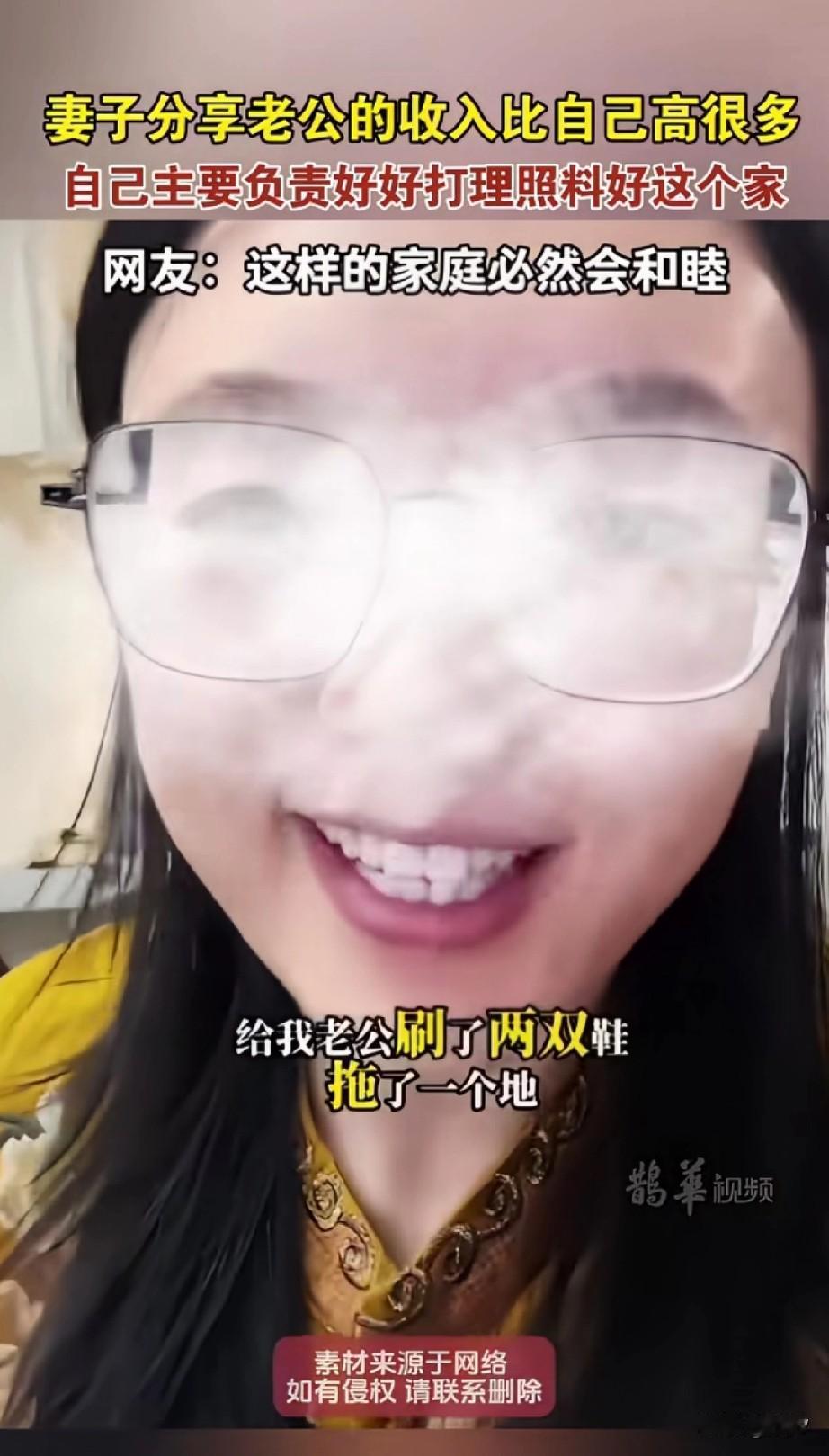 这次分享老公的收入比她的高, 他说当老公一个月的收入, 比我半年的工收入都要高的时候, 我根本不会问我老公要什么公平平等, 我在家一点价值的事情都没有做, 就给老公刷了两双鞋拖了一个地! 老公每天6点出门,晚上9点多还没回家, 我都会提前把饭菜做好,等着他回来吃饭! 现在赚钱都很难,老公压力也非常大,他都这么努力了,我不能拖他的后腿! 不过这个时候还给老公要公平公正,真不知道老公气自己回来是干嘛的,难道还要当个祖宗供起来吗? 网友听到女子的分享,纷纷表示这样的家庭必然会和睦,娶妻如此,家庭自然会越过越好!大家觉得呢? 对老公的看法 对丈夫的看法 夫妻收入差距