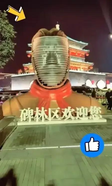 这个兵马俑塑像的脸是LED屏幕,站在后面能把人脸投影上去,当年春节前摆在西安钟楼时,因为造型太丑被连夜撤走了。