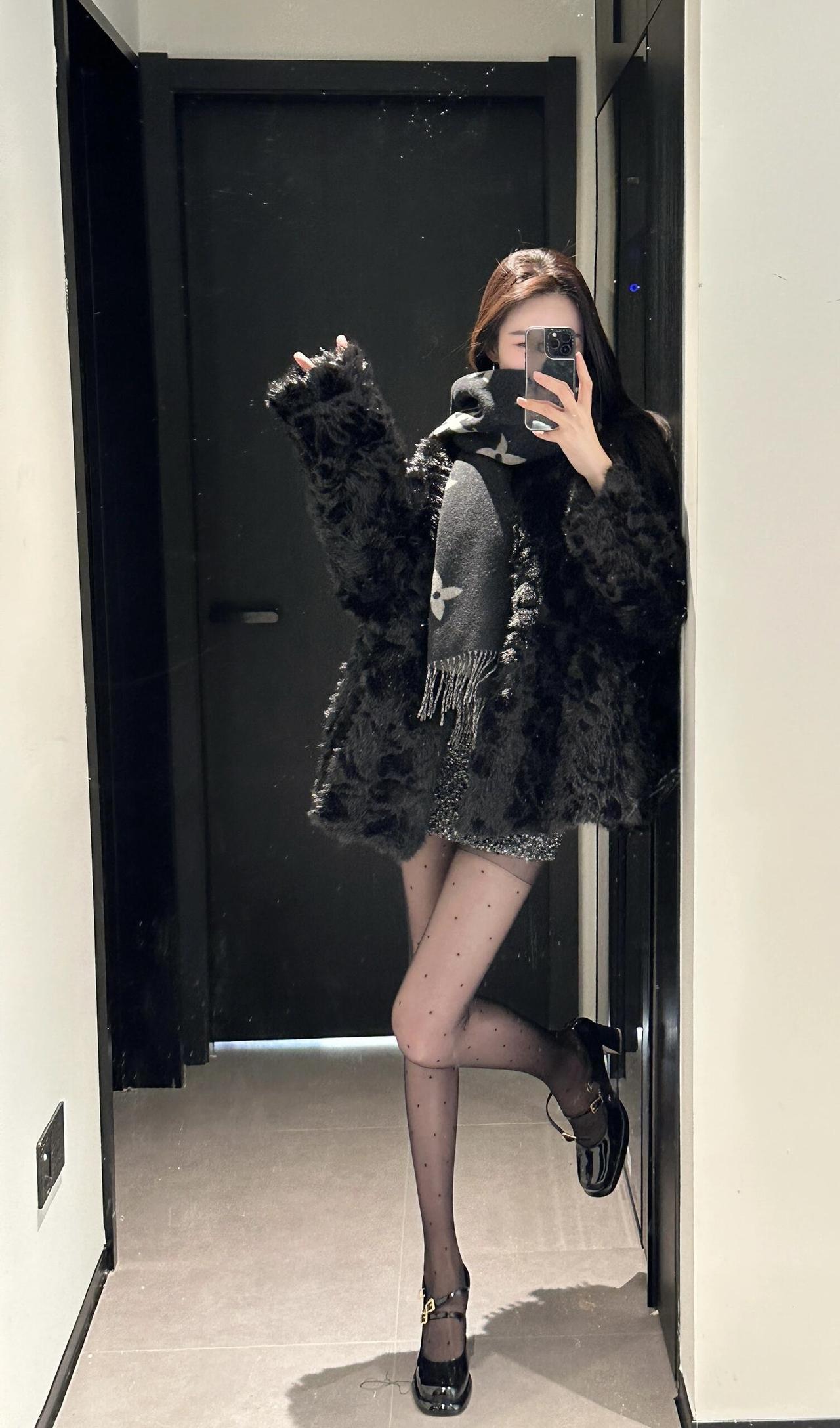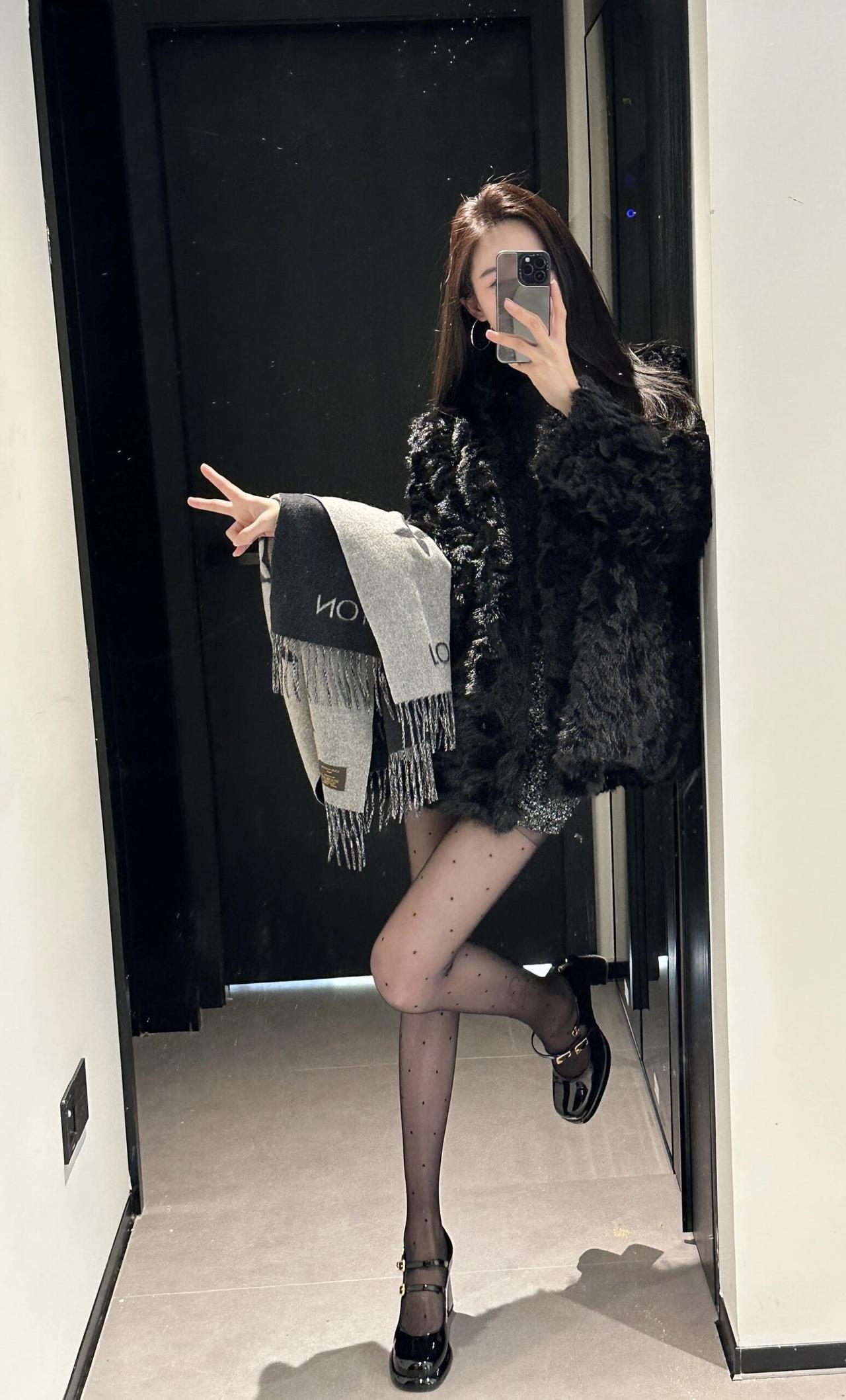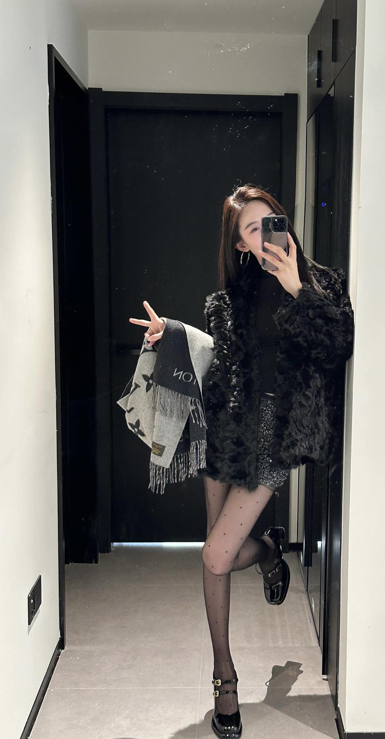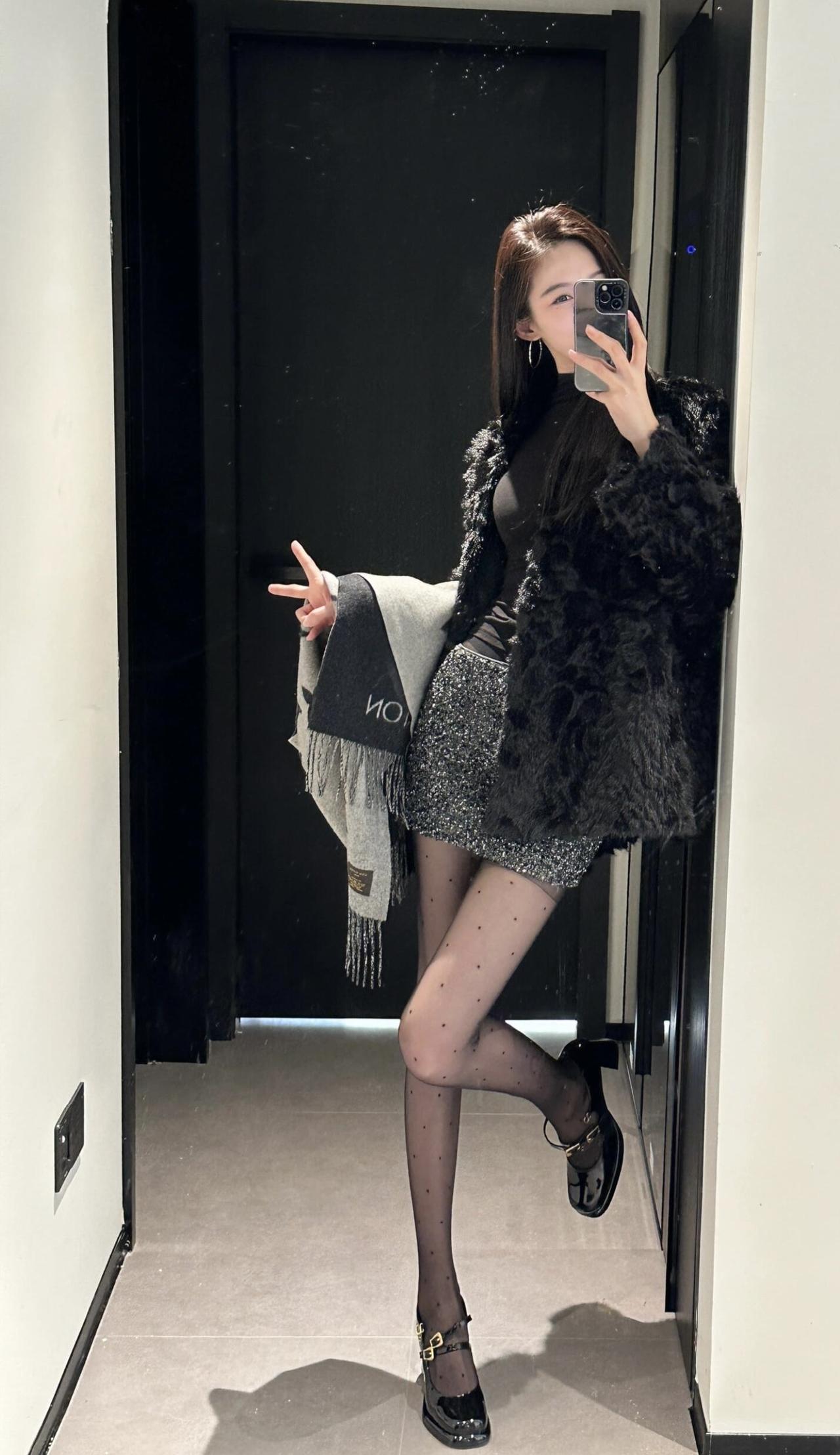 今日穿搭推荐轻熟辣妹风。 上衣:黑色毛绒外套+黑色高领内搭,毛绒外套保暖又显贵,高领内搭修身显瘦,整体是经典的“all black”风格,高级又有质感。 • 下装:亮片迷你短裙,在黑色系中增加了闪耀感,中和了毛绒外套的厚重,让整体造型更灵动。 • 配饰:灰色老花围巾,增加了层次感和精致感;波点黑丝+黑色玛丽珍鞋,既性感又不失优雅,提升了整体的复古氛围。 适合场合 : 日常通勤、闺蜜约会、探店打卡:这套穿搭时尚又上镜,很适合和朋友一起拍照、打卡网红店。