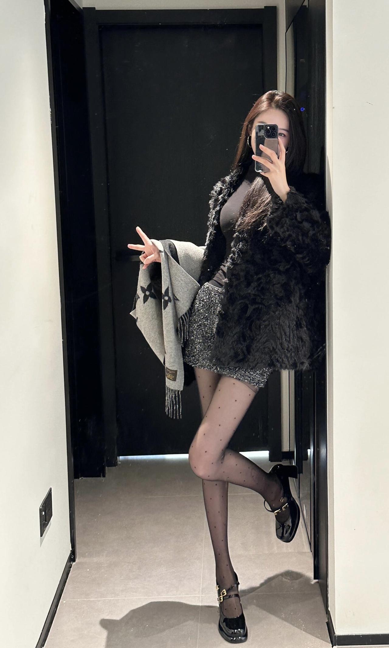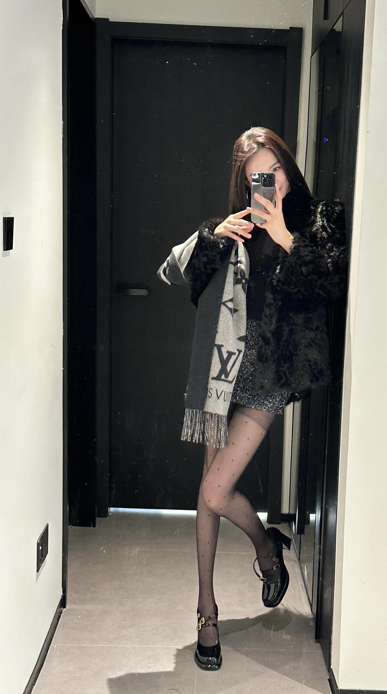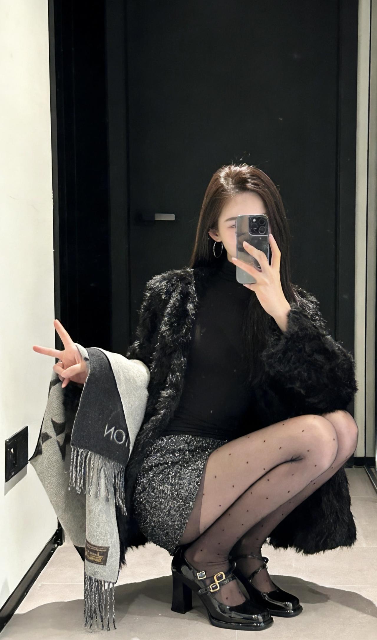 今日穿搭推荐轻熟辣妹风。 上衣:黑色毛绒外套+黑色高领内搭,毛绒外套保暖又显贵,高领内搭修身显瘦,整体是经典的“all black”风格,高级又有质感。 • 下装:亮片迷你短裙,在黑色系中增加了闪耀感,中和了毛绒外套的厚重,让整体造型更灵动。 • 配饰:灰色老花围巾,增加了层次感和精致感;波点黑丝+黑色玛丽珍鞋,既性感又不失优雅,提升了整体的复古氛围。 适合场合 : 日常通勤、闺蜜约会、探店打卡:这套穿搭时尚又上镜,很适合和朋友一起拍照、打卡网红店。