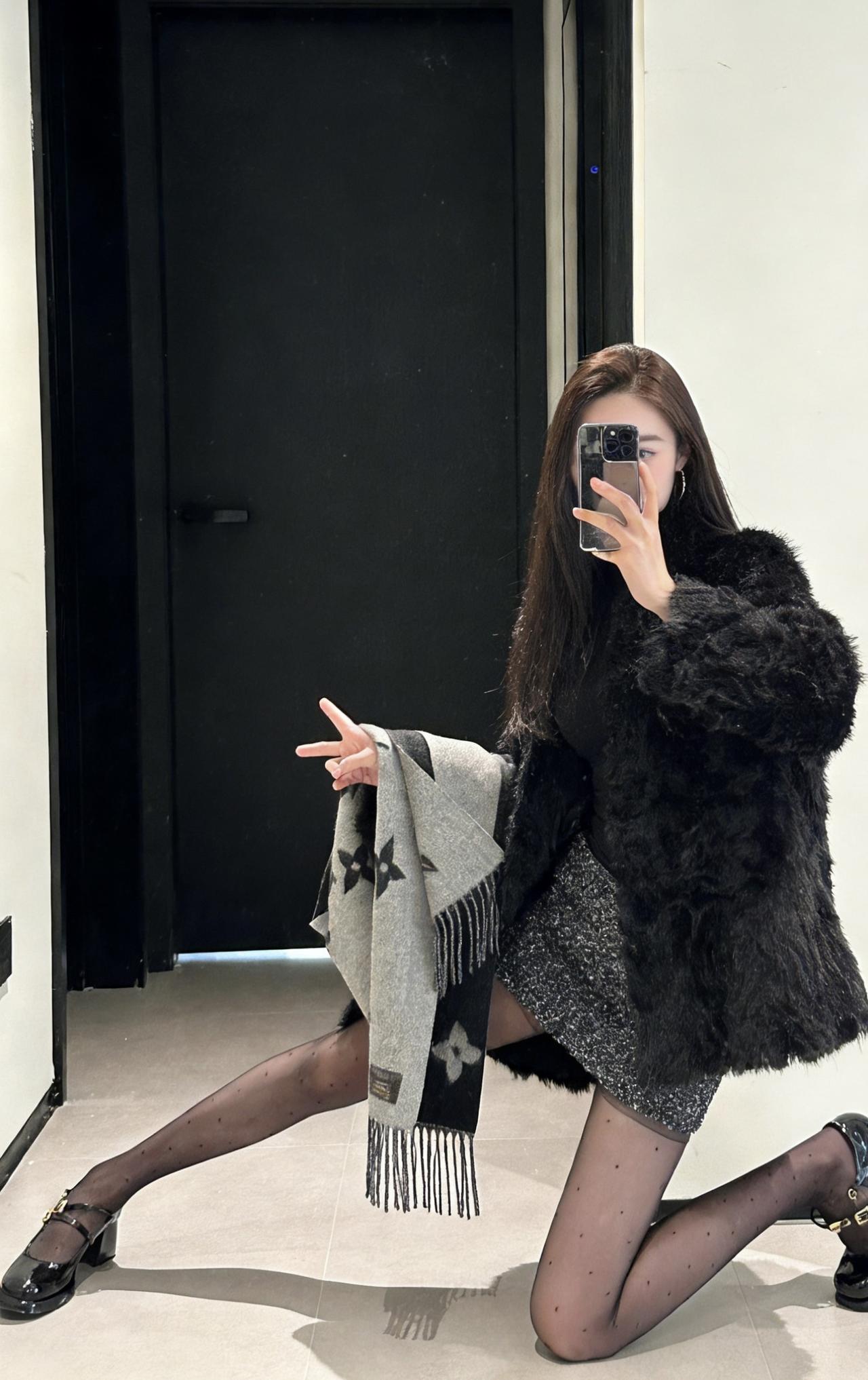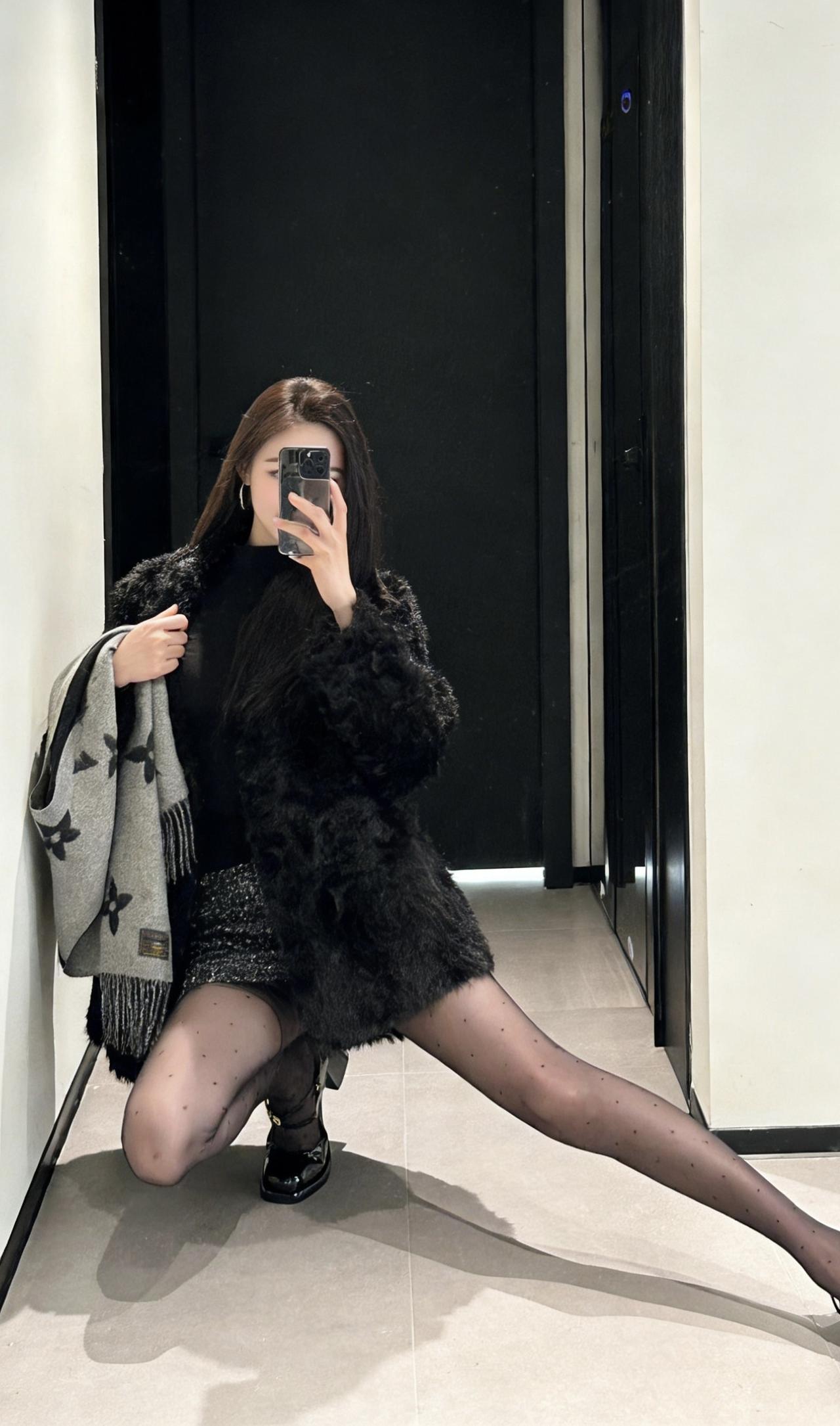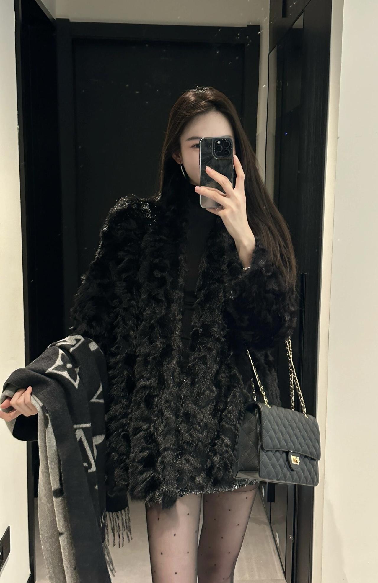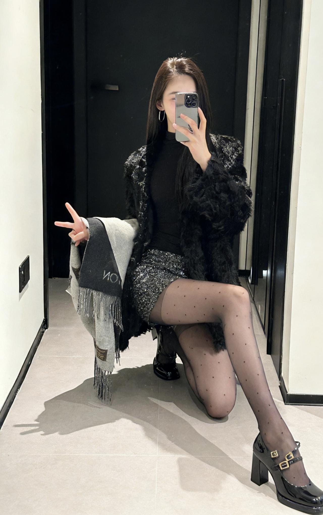 今日穿搭推荐轻熟辣妹风。 上衣:黑色毛绒外套+黑色高领内搭,毛绒外套保暖又显贵,高领内搭修身显瘦,整体是经典的“all black”风格,高级又有质感。 • 下装:亮片迷你短裙,在黑色系中增加了闪耀感,中和了毛绒外套的厚重,让整体造型更灵动。 • 配饰:灰色老花围巾,增加了层次感和精致感;波点黑丝+黑色玛丽珍鞋,既性感又不失优雅,提升了整体的复古氛围。 适合场合 : 日常通勤、闺蜜约会、探店打卡:这套穿搭时尚又上镜,很适合和朋友一起拍照、打卡网红店。