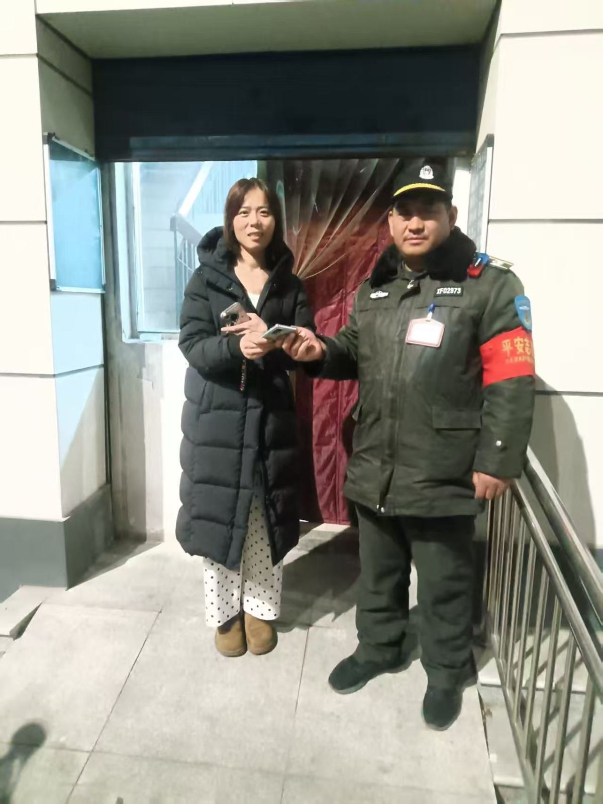 2026年2月11日20时20分许,郑州市中原区桐柏路街道巡防中队队员王年、王宏伟在桐柏北路开元社区附近执勤时,接到一对中年夫妇求助。二人说,他们在桐柏北路与淇河路交叉口附近的桐柏路小学旁散步时,捡到一部小米手机,原地等候多时未见失主,想委托巡防队员帮助寻找失主。
