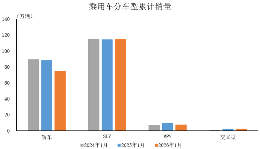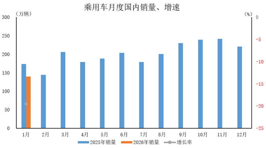 2026年1月,乘用车国内销量139.9万辆,同比下降19.5%,环比下降36.6%。