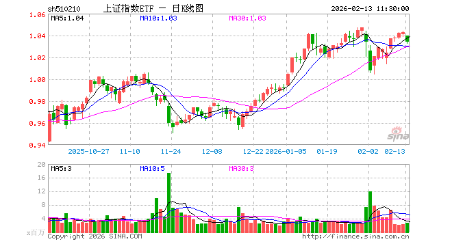2月13日,截止午间收盘,上证指数ETF(510210)跌0.86%,报1.034元,成交额2.83亿元。上证指数ETF(510210)重仓股方面,农业银行截止午盘跌1.51%,中国石油跌4.53%,贵州茅台涨0.43%,工业富联跌0.81%,中国银行跌0.37%,紫金矿业跌3.45%,中国神华跌2.42%,中国人寿跌0.98%,招商银行跌0.41%,中国平安跌1.49%。