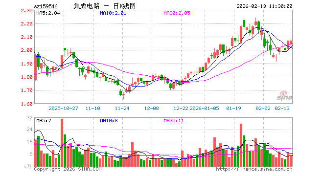 2月13日,截止午间收盘,集成电路ETF(159546)涨0.00%,报2.068元,成交额1355.21万元。集成电路ETF(159546)重仓股方面,寒武纪截止午盘涨0.58%,中芯国际涨0.32%,海光信息跌0.89%,兆易创新涨2.89%,澜起科技跌1.36%,豪威集团跌0.30%,紫光国微跌0.34%,长电科技跌0.32%,芯原股份涨1.99%,通富微电跌0.33%。
