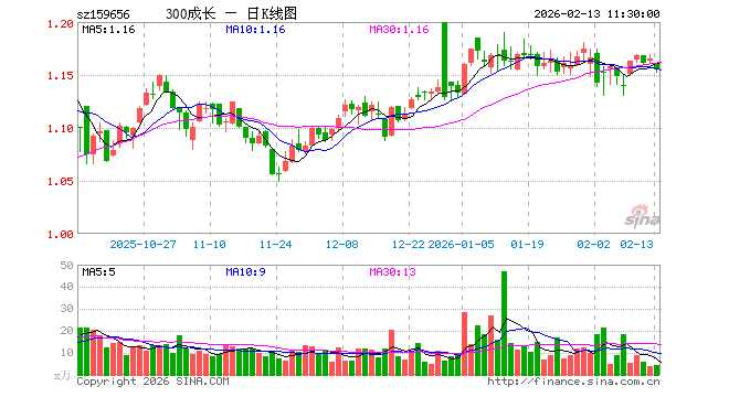 2月13日,截止午间收盘,沪深300成长ETF万家(159656)跌0.86%,报1.155元,成交额515.09万元。沪深300成长ETF万家(159656)重仓股方面,宁德时代截止午盘跌2.07%,贵州茅台涨0.43%,中际旭创跌0.51%,紫金矿业跌3.45%,新易盛跌0.48%,寒武纪涨0.58%,立讯精密跌0.32%,恒瑞医药跌0.58%,比亚迪跌0.98%,阳光电源跌3.54%。