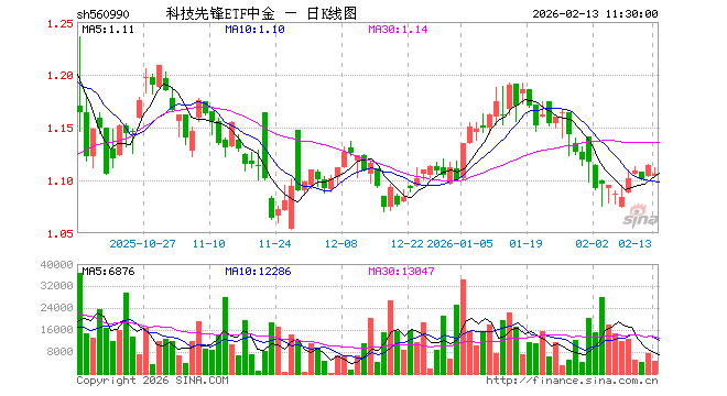 2月13日,截止午间收盘,科技先锋ETF中金(560990)跌0.72%,报1.106元,成交额52.03万元。科技先锋ETF中金(560990)重仓股方面,宁德时代截止午盘跌2.07%,寒武纪涨0.58%,恒瑞医药跌0.58%,药明康德跌1.79%,工业富联跌0.81%,阳光电源跌3.54%,海光信息跌0.89%,立讯精密跌0.32%,中芯国际涨0.32%,北方华创涨3.39%。
