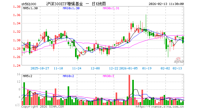 2月13日,截止午间收盘,沪深300ETF增强基金(561000)跌1.00%,报1.293元,成交额238.43万元。沪深300ETF增强基金(561000)重仓股方面,贵州茅台截止午盘涨0.43%,宁德时代跌2.07%,中国平安跌1.49%,美的集团跌0.09%,紫金矿业跌3.45%,立讯精密跌0.32%,招商银行跌0.41%,海光信息跌0.89%,中芯国际涨0.32%,东方财富涨0.04%。