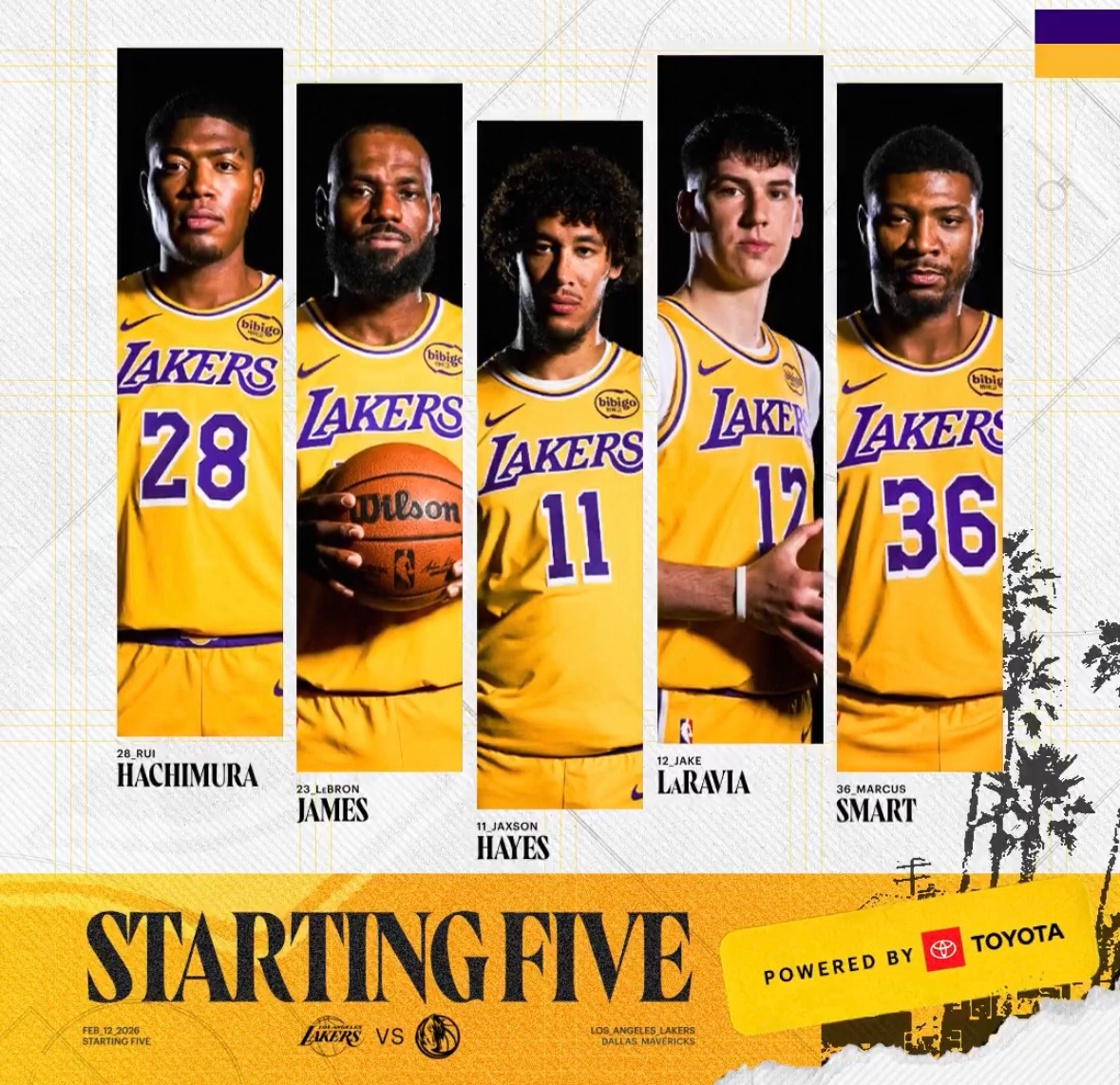 湖人首发:詹姆斯、斯玛特、拉拉维亚、八村塁、海斯独行侠首发:威廉姆斯、小克、马绍尔、华盛顿、加福德