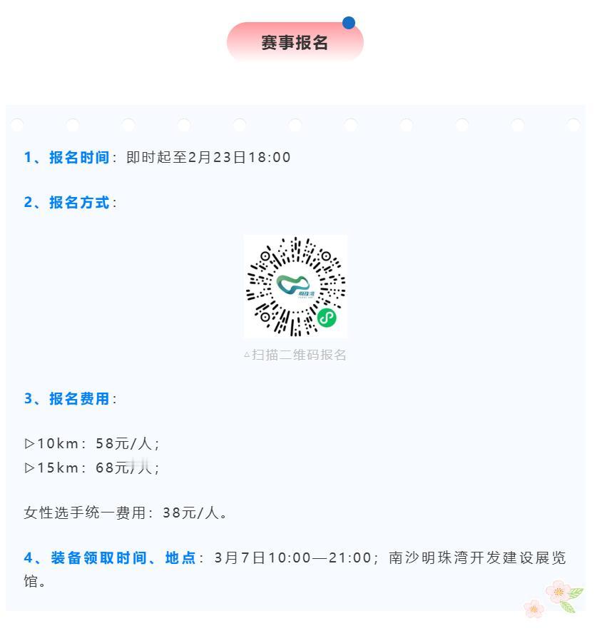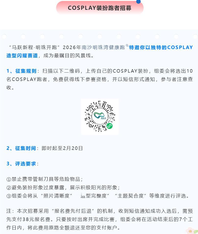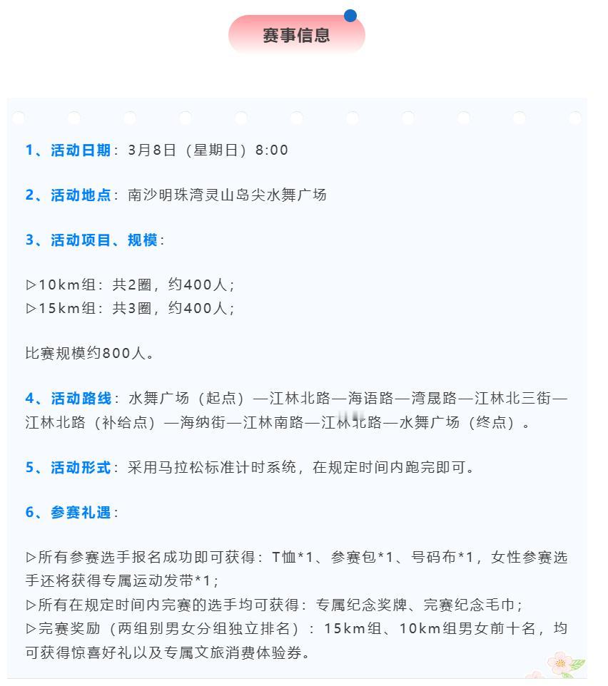 【明珠湾健康跑又来啦!】“马跃新程·明珠开跑”2026年南沙明珠湾健康跑确定将于3月8日在灵山岛尖水舞广场焕新启程! 本次赛事深度融合春日氛围、全民健身理念与“三八”国际妇女节内涵,呼应国家“推进健康中国建设、关注女性全面发展”的政策导向,以体育赛事激活城市活力、凝聚社区向心力。 根据介绍,本次比赛规模约800人。采用马拉松标准计时系统,在规定时间内跑完即可。所有在规定时间内完赛的选手均可获得专属纪念奖牌、完赛纪念毛巾; 活动路线为水舞广场(起点)—江林北路—海语路—湾晟路—江林北三街—江林北路(补给点)—海纳街—江林南路—江林北路—水舞广场(终点)。 本次活动分成了10km和15km两组, 报名分为58元/人和68元/人,女性选手统一费用38元/人。 另外本次健康跑还招募COSPLAY装扮跑者,只要按时出席并完成比赛,组委会将在活动结束后的7个工作日内,将此费用原路全额退还至您的支付账户。
