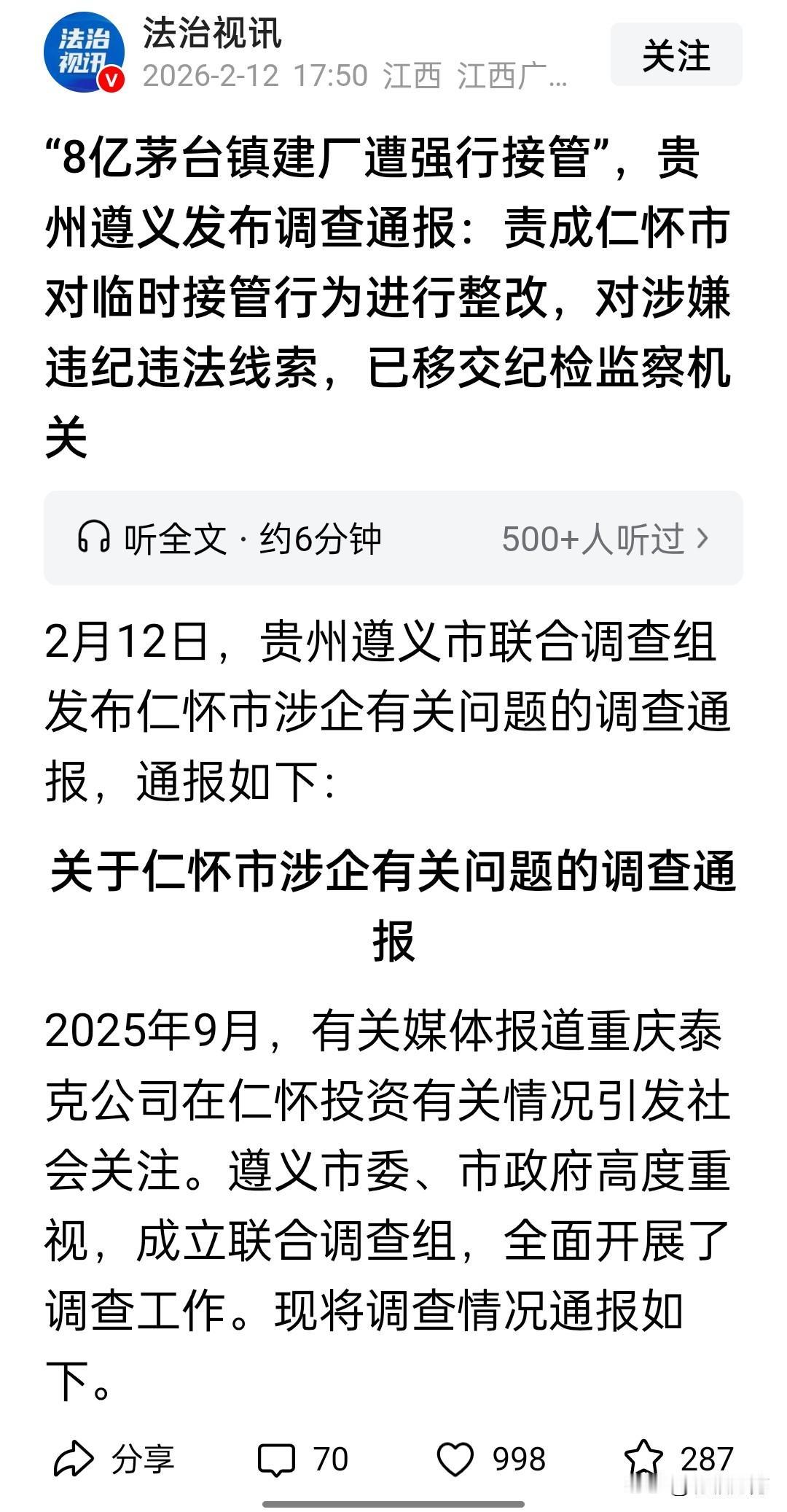 投资建厂却遭强行接管,遵义市发布调查通报:怀仁市接管不合规,移交工厂经营权,并将违法线索移交监察机关。 我觉得,除了追责问责之外,还有其他问题需要考虑。第一个是企业被违规接管,造成的损失应该怎么来弥补;第二个是如何亡羊补牢,管好那只“闲不住的手”。如果企业的利益不能得到有效保障,那么资金只可能困在手里,变成死水,创造不了更大的价值。