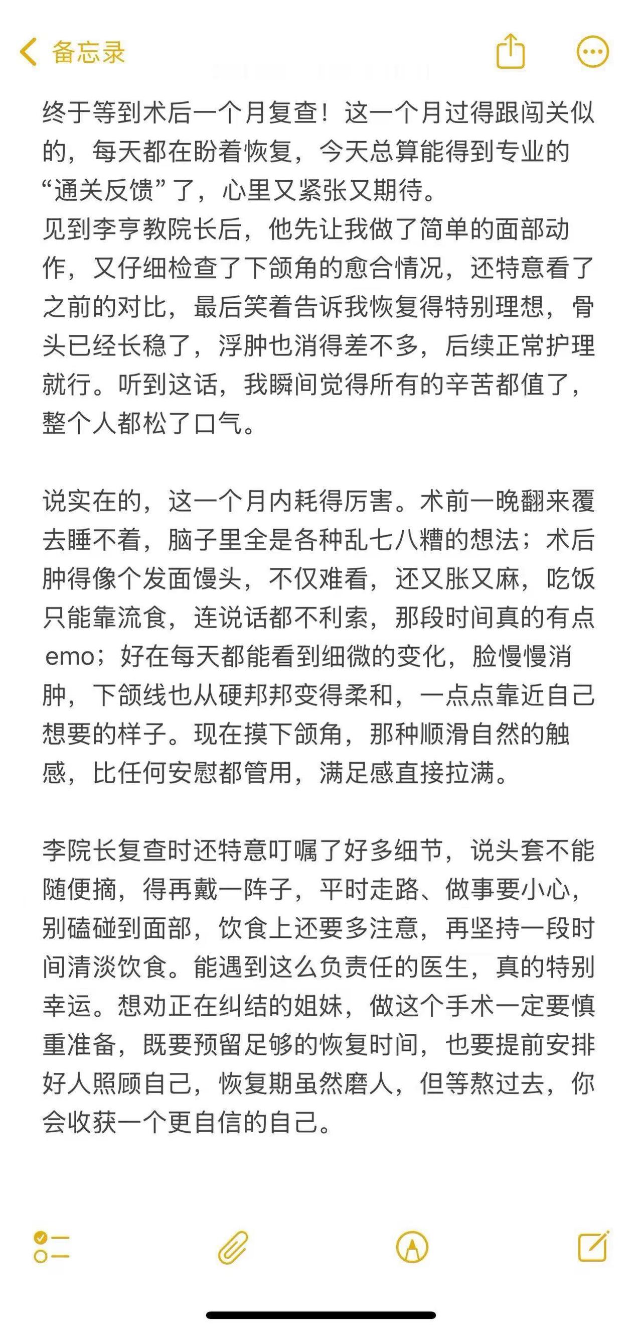 我前面也面过两个大白,他们都是忙碌的边看手机边听我说话,问“会不会留疤”就说“不会”,问“恢复期多久”就说“看个人”,我越听越慌。直到遇到李亨教,他把我的CT片放大,指着每一个细节说:“你的下颌角外扩比较明显,我们会采用长曲线截骨,避免二次角;咬肌有点肥大,可以配合去除咬肌,效果更自然。”他还拿出了和我脸型相似的术前术后对比图,连“术后三个月可能会有轻微下垂”都提前告诉我,让我做好心理准备或者选择术中提升避免下垂发生,那天我走出诊室,第一次觉得“这件事是靠谱的”。术后恢复果然和他说的一样,三个月后脸完全消肿,下颌线流畅得像天生的。原来好的大白,不是给你画饼,而是把风险和细节都讲透,让你明明白白做决定李亨教 磨骨 蘑菇 三件套