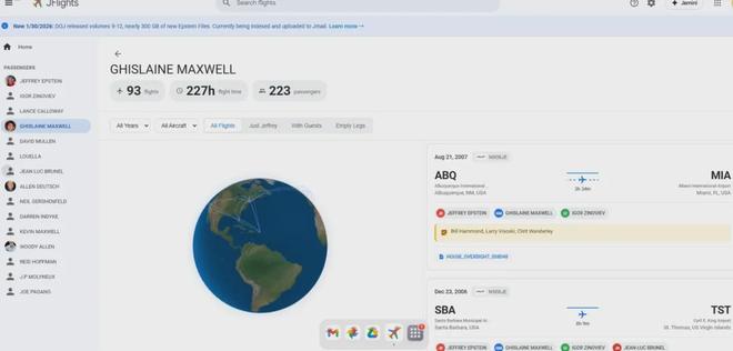 在“爱泼斯坦模拟器”里,可以直观看到“犯罪团伙”的飞行记录,以及按聊天好友的头像来检索之间的邮件交流和攒劲图片,降低了纯检索文字档案的枯燥感。