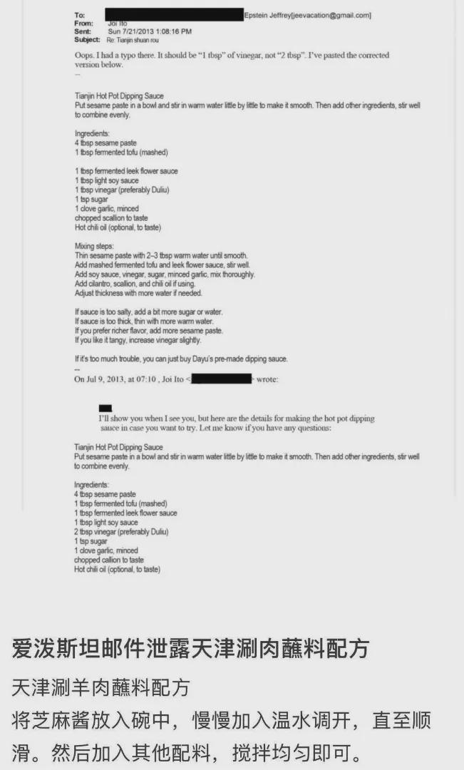 以至于还传出了爱泼斯坦交流“如何制作火锅蘸料”的邮件,不过后面该封邮件被辟谣为了网友整活。