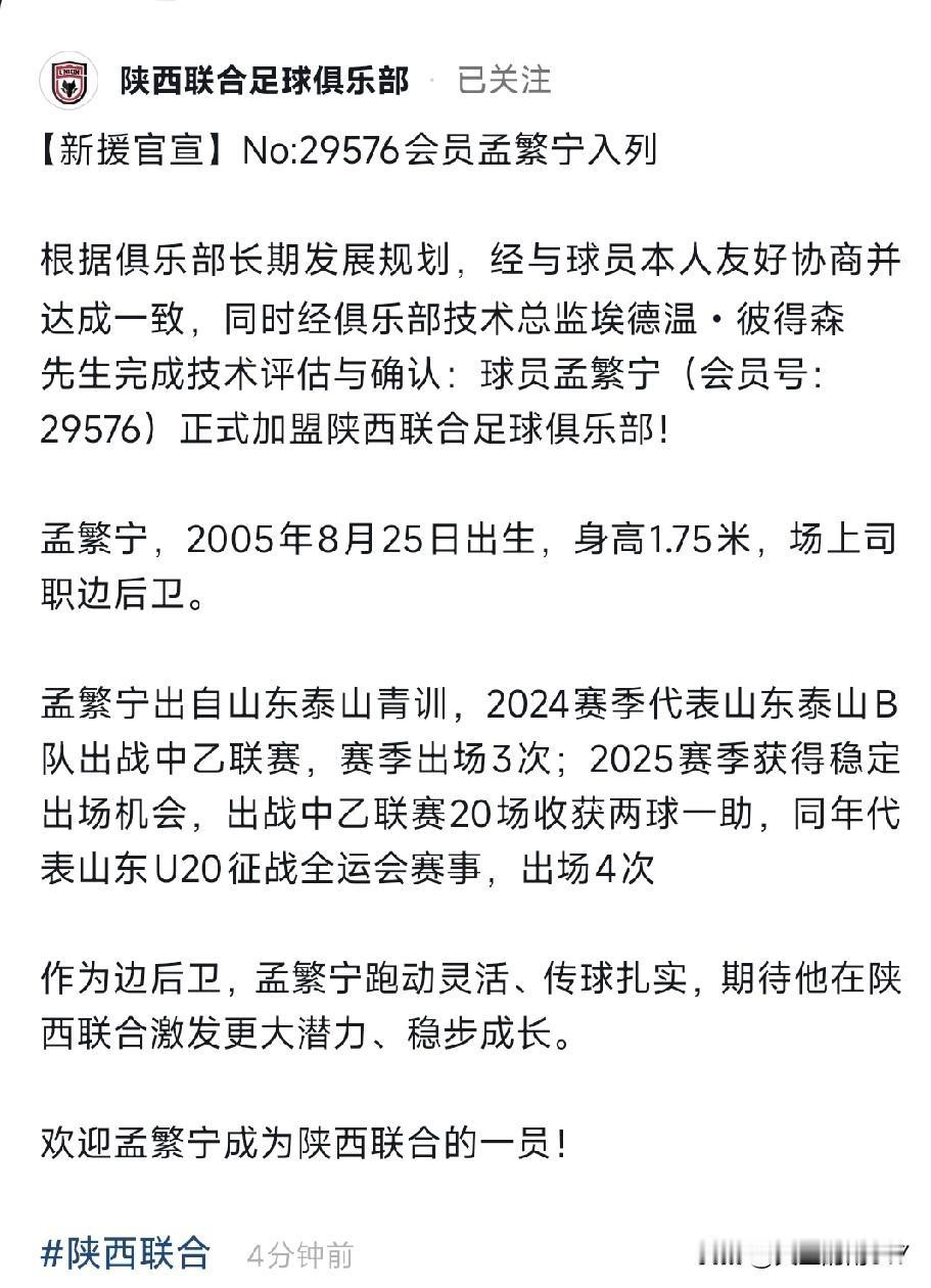 刚刚西北狼陕西联合又官宣了一个球员,来自山东青训的21岁后卫。
