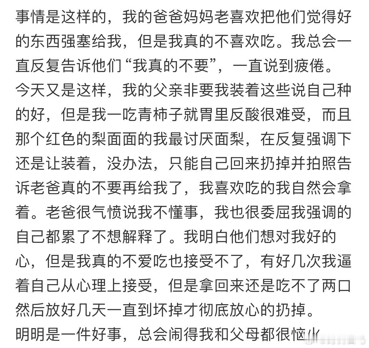 爸爸妈妈老喜欢把他们觉得好的东西强塞给我,我直接扔掉了不要跟老人提喜欢吃什么