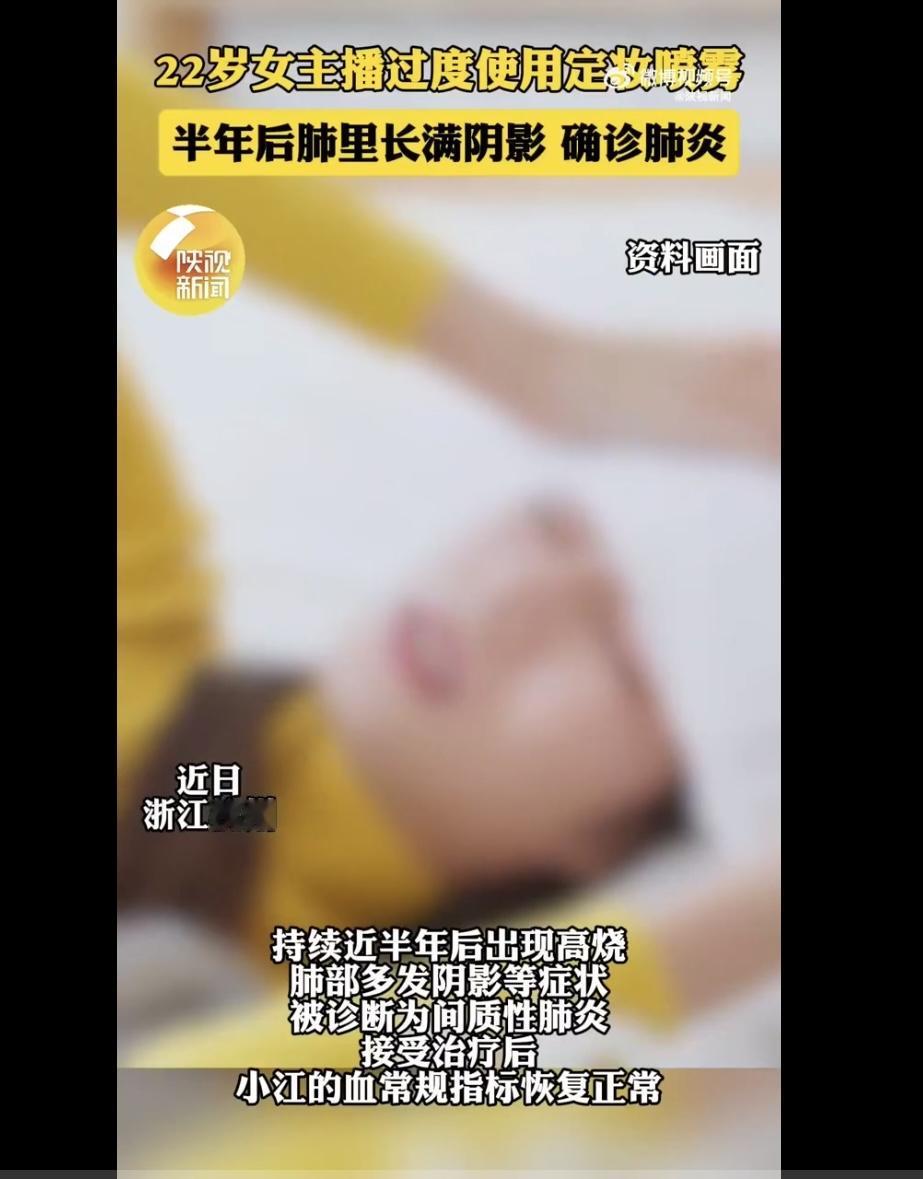 浙江杭州,22岁带货主播小江因每日两次使用定妆喷雾,持续近半年后出现高烧、肺部多发阴影,被确诊为间质性肺炎,经治疗血常规已恢复正常。 医生提醒,定妆喷雾中的挥发性化学成分吸入后会损伤肺部细胞,诱发过敏性肺炎,严重时可引发呼吸衰竭。建议过敏体质人群与儿童尽量避免使用喷雾类产品,使用时避开密闭空间,同时防止产品剧烈碰撞产生易吸入的细小颗粒。