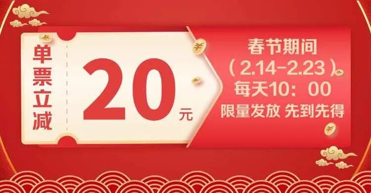 春节期间(2月14日至2月23日),每天10:00面向全市限量发放单票立减20元的惠民观影补贴,用户无需领取,准点进入影片选座页面选座下单即可享受立减,需要注意的是,每天限量发放,先到先得。同时每位用户最多可享受1张立减优惠。