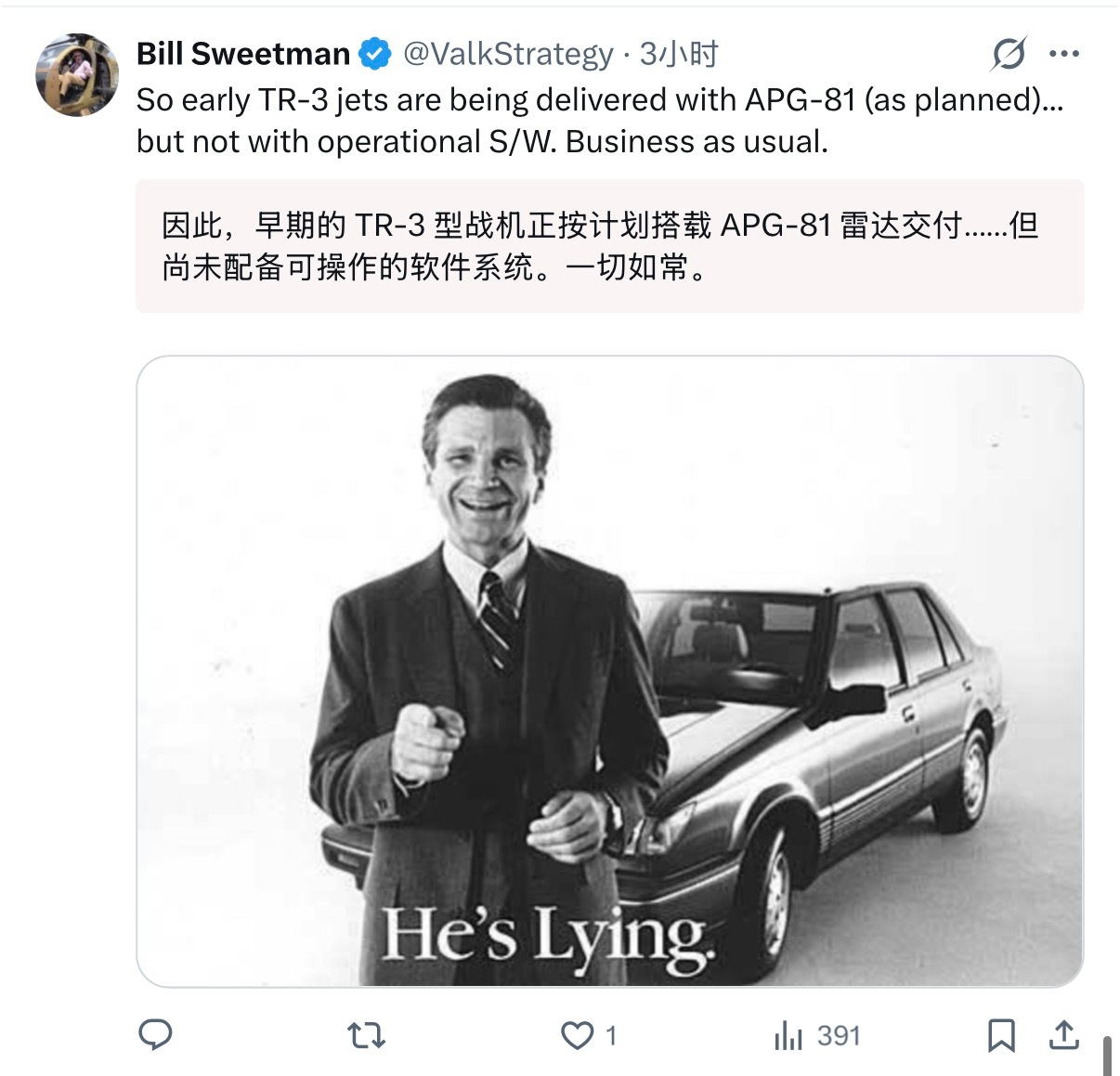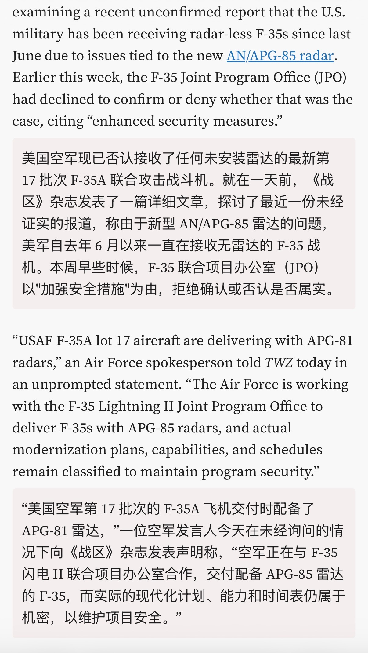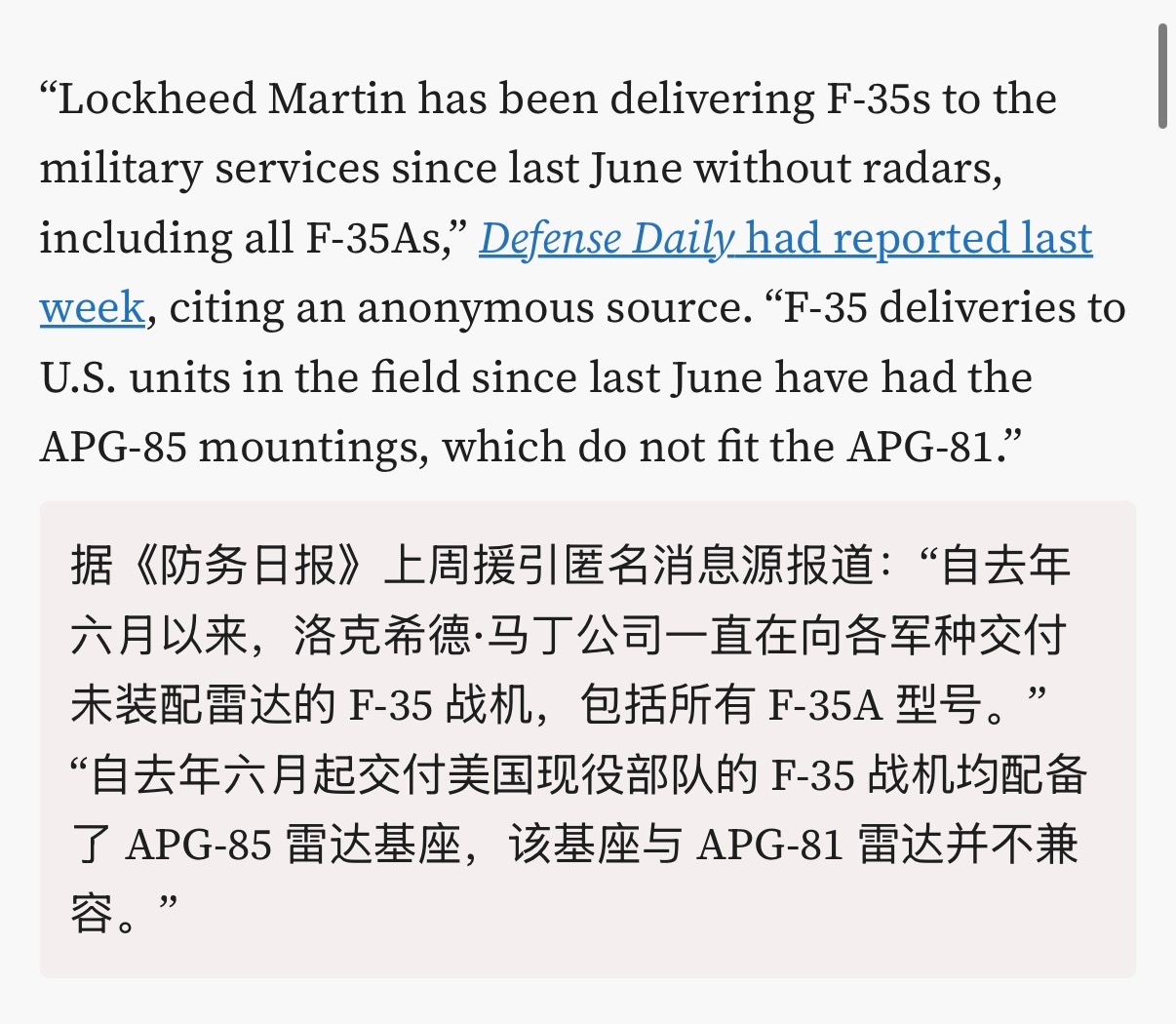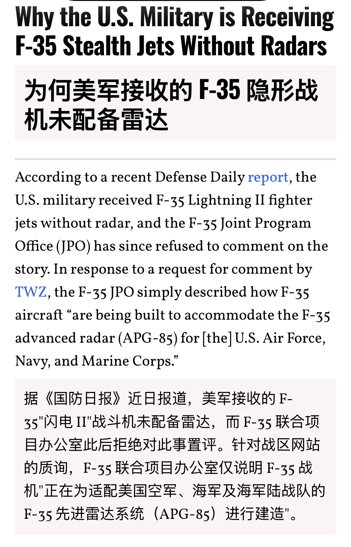 🔻这位是TWZ的主编。🔻现在美军不承认接收了没有雷达的F-35,辩称第17批次的F-35“安装了旧型号的APG-81雷达”。🔻APG-85的底座怎么安装APG-81?🔻连美国媒体和网民自己都不信热点现场海外新鲜事