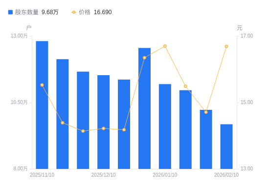 日期A股户数(户)流通A股户均持股数(股)户均持股市值(万元)2026-02-10968323991.386.662026-01-311022353780.445.562026-01-201096613524.435.462026-01-101119243453.175.772025-12-311255273078.965.032025-12-201136293401.364.822025-12-101152923352.304.772025-11-301166213314.094.692025-11-201213293185.494.582025-11-101281253016.534.68