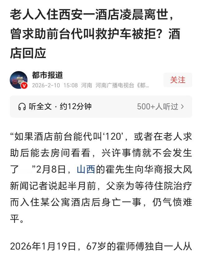 67岁退伍老人只想瞒着孩子悄悄看病,凌晨突发不适向旅馆前台求助,却被冷冷一句“不会打”挡回房间,几小时后孤独离世——这一夜,他不是败在病痛,而是倒在冷漠面前。 1月23日凌晨,陕西西安一间便宜的公寓式旅馆内,67岁的山西老人霍师傅在床上停止了心跳。他的去世,没有家属陪伴,也不是在医院抢救设备前,而是在一间每天40元的普通旅馆房间,孤独地撑不过最后几个小时。 这次来西安看病,老人谁也没告诉。他来自山西,早年当过兵,性格倔强,一生最怕的就是“拖累”这个词。儿子工作忙,他不忍打扰;女儿虽在西安安了家,他也不想“突然上门”破坏孩子的生活节奏。 于是他一声不吭,独自坐车来到西安。因为医院床位暂时紧张,他没吭声,找了家最近最便宜的旅馆,每天只要40块钱。他想等医院通知有空床就直接住进去,也许调理几天身体就能回家,不声不响地解决一场危机。 可事情没那么简单。1月23日凌晨3点多,霍师傅突感身体不适,胸口疼痛、头晕乏力。他挣扎着穿衣起身,慢慢摸索到旅馆前台,希望工作人员帮他拨打一下120。他的语气平静但虚弱,眼神里满是求助。 但前台人员只是抬头看了他一眼,回了句:“我不会打。”没有询问病情、没有尝试帮忙,甚至没有提醒他可就近求医。相反,还让他“自己联系家人”。 老人低下头,没有再说话。他用的是老年按键机,刚换的新手机几乎不会操作,尤其在突发身体问题时,根本无力展开复杂操作。他也不愿惊扰孩子,更不知如何是好。 他一步步缓慢挪回自己的房间。他以为,天快亮了,再熬一会儿就好。可现实没有给他半点余地。凌晨5点47分,霍师傅在房间内病发去世。 直到早上8点,前台交接班提到有老人凌晨来过,说自己不舒服。工作人员前往老人房间查看,才发现他早已没了呼吸——心跳停止、瞳孔放大,现场再无生机。 酒店这才拨打电话通知家属。家人闻讯后匆忙赶来。看到老人最后孤身等待、没有抢救、也无人回应的监控画面,他们悲痛欲绝,愤怒难抑。他们质问酒店——凌晨明确说身体不舒服,也表示需要帮助,是不是就一个电话的距离,就能救下父亲? 酒店工作人员则回应模糊不清,一会说“老人只询问了位置”,一会说“不知严重程度”,始终回避“是否尽力协助”这个关键问题。 从法律层面分析,《民法典》第1198条明确指出,宾馆等经营场所经营者,对场所内人员负有合理范围内的安全保障义务。尤其在住客明确表达身体不适、请求代为拨打急救电话的情况下,前台人员不仅未提供协助,甚至没有采取任何跟进行为,构成了对基本保障义务的失职。 《民法典》第1165条同样规定,若行为人因过错侵害他人民事权益,造成损害的,应依法承担责任。当前台面对明显的求助行为漠然置之,这种“看到了却不管”的懈怠,属于具有过错的不作为。尤其考虑到老人为住客身份,而前台为酒店代表机构,其失职行为直接影响到整个经营单位的责任承担。 在人流密集的场所,对于明显健康异常甚至求助的个体,如果经营者对此无视或冷处理,法律上可能构成“因未尽义务导致不可逆后果”,须承担相应的民事赔偿责任。从已有信息看,老人从求助到去世之间长达2小时,中间前台人员既未拨打120,也未进房查看病情,无任何实际举动阻止悲剧发生。 换个角度看,这并不是一起突发事故,而是一场可以规避的死亡。而将它变得无法逆转的,不是病情发展之快,而是眼前那句“不会打”的推托。 在司法裁量空间内,此案若提起诉讼,酒店方面可能面临履责不当导致住客死亡的侵权责任。不仅仅是赔偿数字的问题,更是是否履行最基本人文反应与机构反应力的根本考察。 很多人可能不理解,拨打120难吗?这件事,其实不需要任何医疗知识。一个电话,一次陪同,一句确认,都可能挽回一个人的生命。而当人关闭了责任意识,这些动作就成了“别人家的事”。 老人只是不想麻烦孩子,可他在陌生城市唯一感到不适的时候,敲不开求助之门。比疾病更伤人的,是本该伸出的手没有伸出来,是一个人明明开口了,依旧等不到回应。 背后涉及的不只是老人的命运,还有整个社会对此类事件应有的反省角度:面对突发健康困境,我是否有责任?机构是否准备好回应?在信息、技术、时间都不缺乏的当下,“冷漠”是否最该被追责?