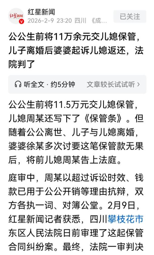 “借你保管,不等于白送!”四川攀枝花一位儿媳,保管公公生前积蓄11.5万元,却在