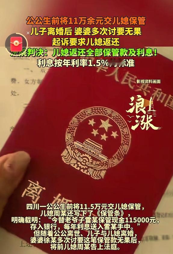 “借你保管,不等于白送!”四川攀枝花一位儿媳,保管公公生前积蓄11.5万元,却在他去世后一分不还,理由竟是“早过三年诉讼时效了”。婆婆气得怒告法庭,8年后的保管条立下大功,法院明确:儿媳败诉,该还! 2017年初,四川攀枝花的雷某年过六旬,在处理个人积蓄时,出于对儿媳周某的信任,亲手把11.5万元现金交给她,请其帮忙代为保管。交接时,周某写下一张《保管条》,白纸黑字写明:“今保管老爷子雷某存款11.5万元,存入银行,每年利息交雷某个人使用。” 这张《保管条》虽然朴实无华,却字条清晰,直指保管关系成立,也成为日后纠纷的关键证据。 起初几年,周某照规矩行事,每年将银行利息转交给公婆,用作老人日常生活开销。虽然未见存单或利息明细,但雷某也从未追问,更没有追究,显然对儿媳心存信任。 直到2020年6月,雷某突然因病去世,一切开始发生变化。自那年起,周某不再交付利息,公公留下的11.5万元本金也毫无声息。面对沉默,婆婆徐某一开始选择相信周某,认为她也许有困难。可等来的却不是解释,而是一场离婚。 2024年7月,周某与徐某之子协议离婚。身份一变,徐某突然意识到,自己丈夫的这笔积蓄理当归还,却迟迟没有动静。 她主动找上周某数次,希望对方归还全部保管款。周某却一口拒绝:“都过了诉讼时效了,法律也不支持你。”言下之意,这11.5万元,她一分钱也不会还。 情急之下,徐某将前儿媳周某诉至法院,要求归还丈夫生前存款11.5万元及利息。她表示:这是双方自愿形成的保管关系,儿媳只是代为保管,而非赠与或借贷,现在当事人去世,合法继承人有权请求返还本金及孳息。 被诉到法院后,周某给出了完全不同的说法。她主张,这11.5万元是帮雷某收回的一笔债务,两人之间并非单纯保管,更无归还约定。她还拿出一本记事本,上面记录着“旅游费用”、“雷某亲自支取”等字样,比如2018年雷某从保管款中拿走了2万元、利息支付1500元两次。与此同时,她坚称已履行保管义务,现在不应再返还。 徐某则回应:“别的我不多说,你拿出的这些记录上,全都没有我丈夫签名,连时间地点都模糊不清,也没有任何第三人证实。”她坚持,《保管条》写得清清楚楚,既然是保管,就该原封不动归还。 法院在审理后,围绕焦点问题进行了详细调查。 其一是保管合同是否成立。法院根据《民法典》第九百条作出认定:双方确已形成保管合同关系,雷某生前交付现金,周某书面确认内容合法有效,构成民事法律行为。 其二是诉讼时效是否已过。法院指出,《保管条》中未约定明确期限,根据《民法典》第五百一十二条及第一百八十八条,寄存人或其继承人在提出返还请求时,若保管人未返还,则诉讼时效从“知道或应当知道权利被侵害”之日算起。从徐某首次主张返还至起诉时间未满三年,尚在诉讼有效期内,周某抗辩不成立。 其三是款项是否已经部分返还或花费。周某所提交的笔记并无雷某签名,亦无旁人证实,仅能说明其自行记录行为,不能视为双方一致的财务处理协议。 另据查明,雷某去世后,其子女雷某堂、徐某英均书面放弃继承该笔款项,确认母亲徐某为唯一继承人,具有追偿资格。因此诉请主体合法。 最终,法院依据法律作出如下判决:周某应依法返还11.5万元本金,并自2017年1月1日起,以银行一年期定期存款利率1.5%计算利息,直至支付之日。同时,法院未采信徐某关于“4.25%利率”的主张,认为应以实际约定与合理利率为限。 这一案件引发不少讨论。保管人是否能因时间久远逃避法律责任?口头承诺能否代替法律契约?家庭成员之间,信任是否等于法律豁免? 事实上,从《民法典》的角度出发,只要双方形成真实意思表示并有证据佐证,即便是亲属之间亦构成法律关系。所谓“口头说法”、“习惯做法”不能取代《保管条》这一书面合同。 《民法典》第1091条也规定,继承人有权依法请求返还死者生前债权或财物。继承不是形式概念,而是权利延续。 家庭关系再亲密,本质上也不应凌驾于法律之上。那些看似“自家事”的钱财,一旦涉入合同义务、保管责任,在继承方向法院主张权利时,就不可再简单归于“婆媳矛盾”或“家庭纠纷”。 在这个案件中,曾经的一纸保管约定,最终在八年后成为定纷止争的核心证据。财产在亲人之间流转,但法律权利不能“默默沉睡”。时间可以模糊记忆,却不会抹除证据。 保管不是“借口”,信任也不能“免账”。毁约者终需依法归还,这是对关系的敬畏,也是法律的底线。