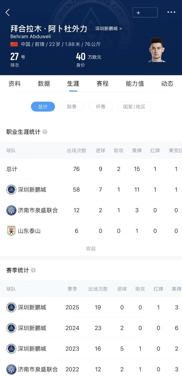 拜合拉木·阿卜杜外力,2003年3月8日出生于新疆伊犁,身高188cm,司职前锋。拜合拉木从内蒙古盛乐蒙羊足球俱乐部开启足球生涯,2021年转会至山东泰山足球俱乐部青训梯队,职业履历扎实,曾先后助力济南兴洲、四川九牛斩获中乙、中甲联赛冠军,拥有丰富的联赛经验。