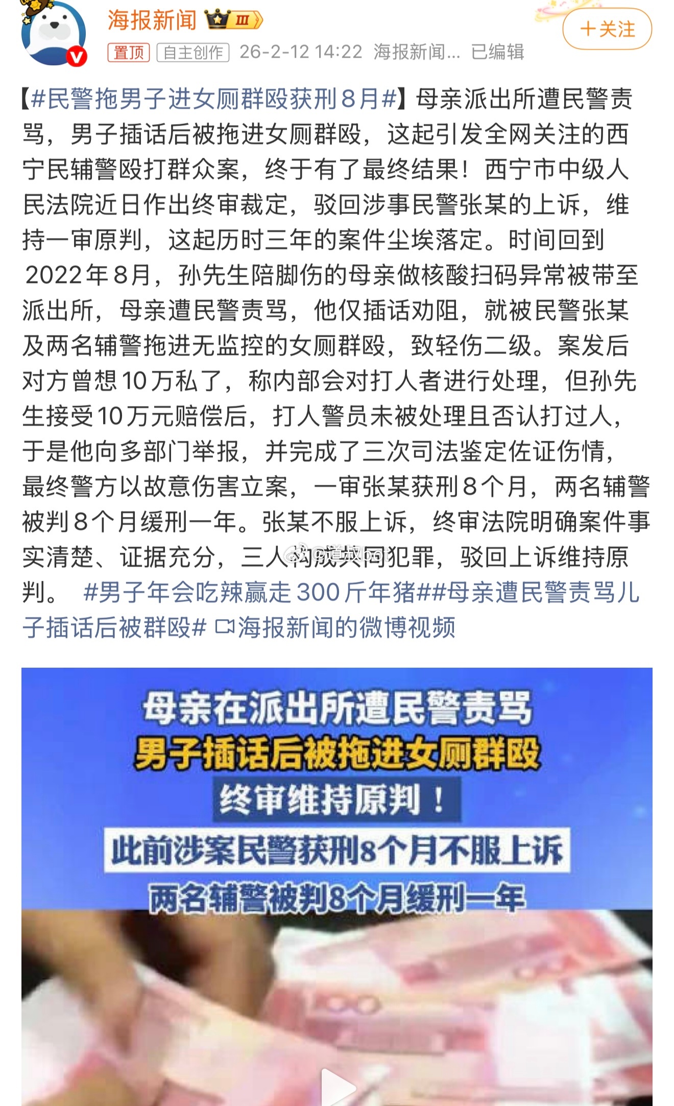 母亲派出所遭民警责骂,男子插话后被拖进女厕群殴,最终,驳回涉事民警张某的上诉,维持一审原判,一审张某获刑8个月,两名辅警被判8个月缓刑一年。