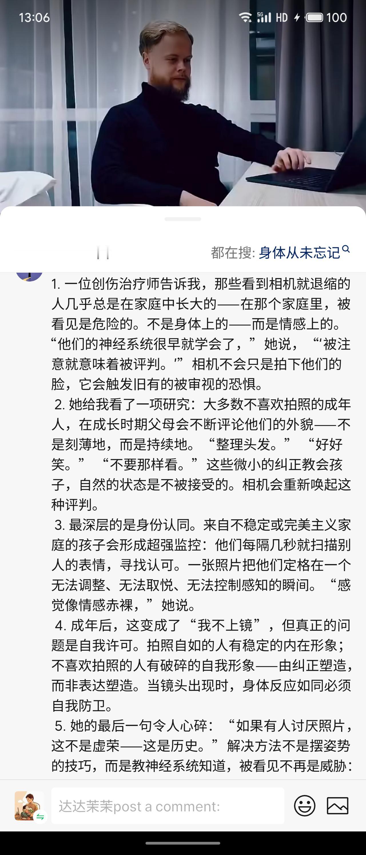 讨厌拍照常被看作“不上镜”或虚荣,但治疗师指出:这往往是童年情感创伤的印记。在频繁评判外貌的家庭中,孩子学会“被看见=被审视”。镜头会唤醒这种旧有恐惧,让人感到情感赤裸、无法防御。所谓不自信,实则是长期被纠正塑造出的破碎自我形象。讨厌照片不是虚荣,而是历史。解决方案不在摆姿势,而在重建“被看见不等于危险”的神经认知。——这一视角将个体行为升华为创伤反应,提醒我们:对镜头的抗拒,也许是一种沉默的自我保护。