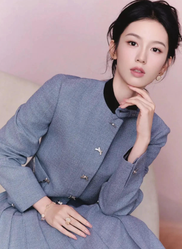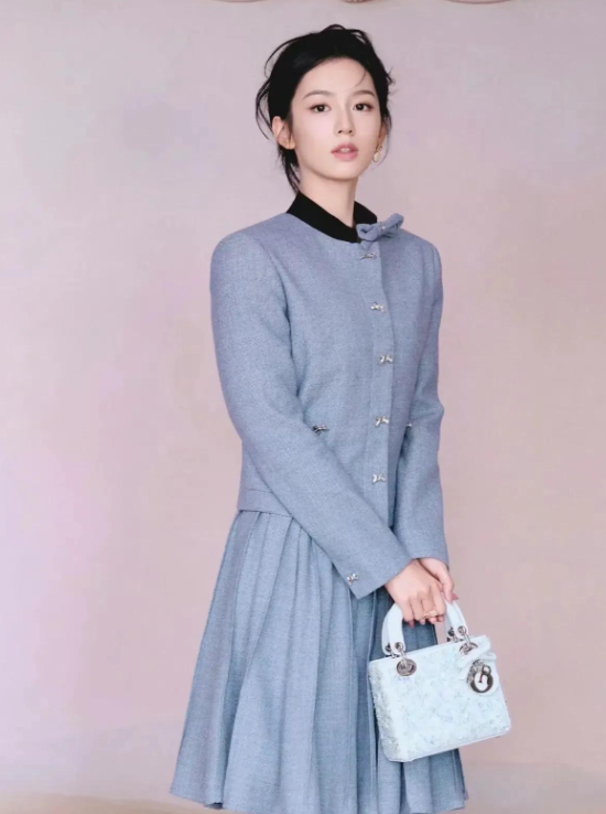 周也画精致淡妆,身穿一身灰色套装裙气质简直不要太好