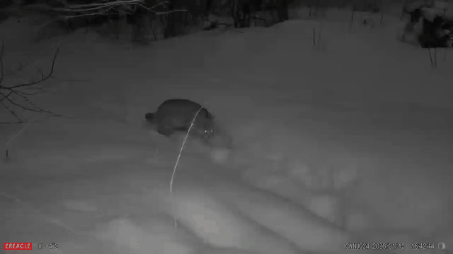 视频画面中,一只豹猫在红外相机前亮相,琥珀色的眼睛在黑暗中闪烁如幽光,迅速离去,展现出捕食者特有的机警特质。
