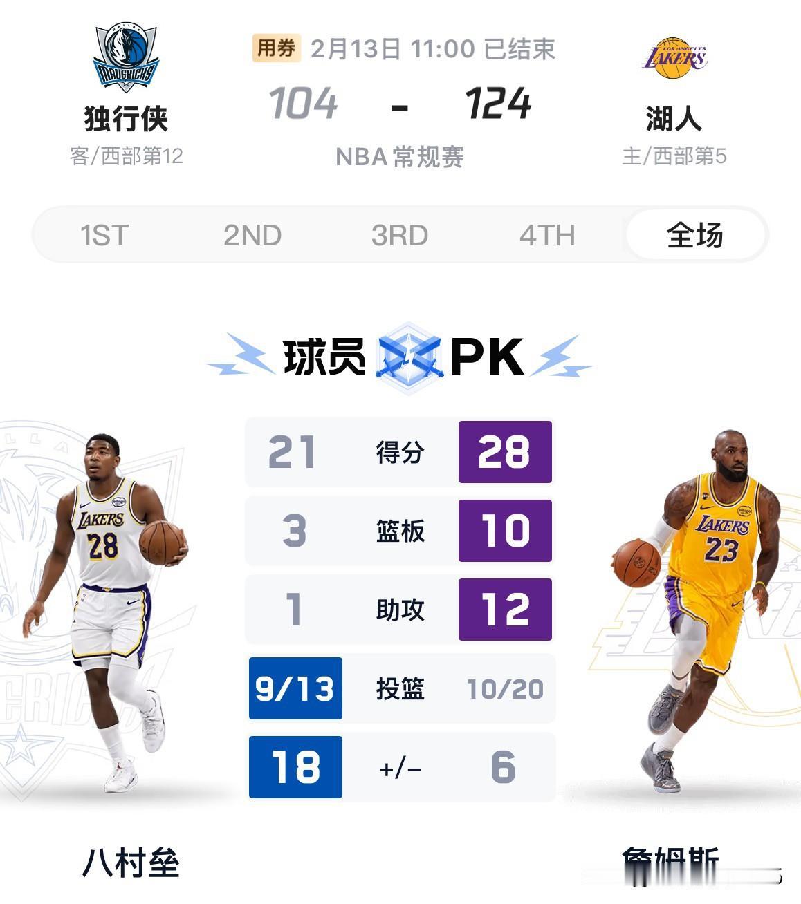 今日湖人迎战独行侠,东契奇继续高挂免战牌,詹姆斯砍下28分10板12助,成为史上年龄最大砍下三双的NBA球员,湖人124:104 战胜独行侠,排名重返西部第五。