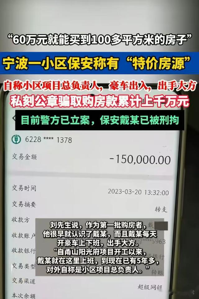 不想占便宜就不会吃亏!浙江宁波,男子花60多万,从项目负责人手里买了一套原本近200万的房子,钱付过去后,负责人不见了!接下来,陆陆续续有十几个人投诉遇到了同样的问题,经过调查,那个自称项目负责人的人,竟然只是小区保安! 据济南日报.爱济南报道,2023年,刘先生在奉化区某小区买了一间沿街商铺,在那开店做起了生意。刘先生的生意不错,很快就又攒下了一笔钱。 刘先生是第一批买这个小区房子的人,从他在那开店,就认识了戴某。 戴某每天穿的人五人六的,上下班都开着豪车,刘某开店后,戴某偶尔会去刘某店里消费,双方打过不少交道。 戴某平时谈吐不凡,出手也非常大方,刘某和他熟悉后,打听过他是干什么的,戴某说他是这个小区的项目负责人。 刘某一听,这个戴某竟然还是大人物,不禁对他肃然起敬。 2026年1月底,戴某和刘某闲聊的时候,说他手里有几套特价房源。 刘某顿时打起了精神,这个小区综合评价不错,他早就想在这买一套房子了,只可惜房子不便宜买不起,如果戴某有途径,那可太好了! 刘某立即向戴某打听了起来,两人聊完,刘某立即心动了!原来,按照市场价,刘某这个小区一套100多平的房子,需要近200万。 但是,戴某说的那几套房,价格只有大约市场价的三分之一。刘某当场决定订一套房,并全额转给了戴某60万。 让刘某没想到的是,2月8号,他再联系戴某的时候,突然联系不上他了。 和刘某有同样经历的,还有邱女士。 2023年3月份,邱女士通过戴某买了一套花园洋房,戴某说那是一套样板间,所以卖的便宜。 邱女士的那套房子总价110余万,也只有市场价的三分之一,房子定下来后,邱女士付给了戴某15万定金,又付了21万的首付。 但是,邱女士的房产证一直没办下来,戴某给出的理由是,小区里的房子没卖完,样板间还需要继续使用。戴某让邱女士先别去住,他们会付给邱女士租金。 后来,戴某又说样板间没有通燃气,暂时办不了房产证,邱女士可以入住,但是不能把房间弄乱。 2025年7月,邱女士搬进了这套房子,但是房产证一直没办下来。 越来越多人称自己通过戴某买了房,但是都遇到了刘某和邱女士同样的事。大家建了一个维权群,群里有十几个受害者,涉案金额达到了一千多万。 为什么这么多人都被骗了呢?难道是他们不够聪明? 原来,戴某和每个人都签了房屋订购单,上面有房产公司销售部的公章,加上他平时豪车出入、出手阔绰,大家都对他信任有加。 出事后,房产公司出面回应,称这个戴某只是一个保安,并不是什么项目负责人。 民警介入调查后发现,戴某存在大量个人借款,还私刻了房产公司公章,他卖出去的房子,大多数都是洋房和别墅,平均市场价300万,可戴某的卖价只有市场价的三分之一。 目前,戴某已经被刑事拘留。 戴某的行为应该如何认定?他会受到什么处罚? 戴某的行为应认定为诈骗罪。《刑法》第二百六十六条规定,诈骗罪是指以非法占有为目的,用虚构事实或者隐瞒真相的方法,骗取数额较大的公私财物的行为。 戴某虚构项目负责人的身份,以远低于市场价的价格吸引买房者,还私刻公章与买房者签订房屋订购单,已经构成了诈骗。 戴某诈骗金额达到一千多万,属于数额特别巨大。 根据规定,诈骗公私财物数额特别巨大或者有其他特别严重情节的,处十年以上有期徒刑或者无期徒刑,并处罚金或者没收财产。 此外,戴某私刻房产公司公章,还触犯了《刑法》第二百八十条,构成伪造公司印章罪。 按照规定,伪造公司印章的,处三年以下有期徒刑、拘役、管制或者剥夺政治权利,并处罚金。 戴某应该被数罪并罚,最终刑期还需要仔细调查后才能确定。